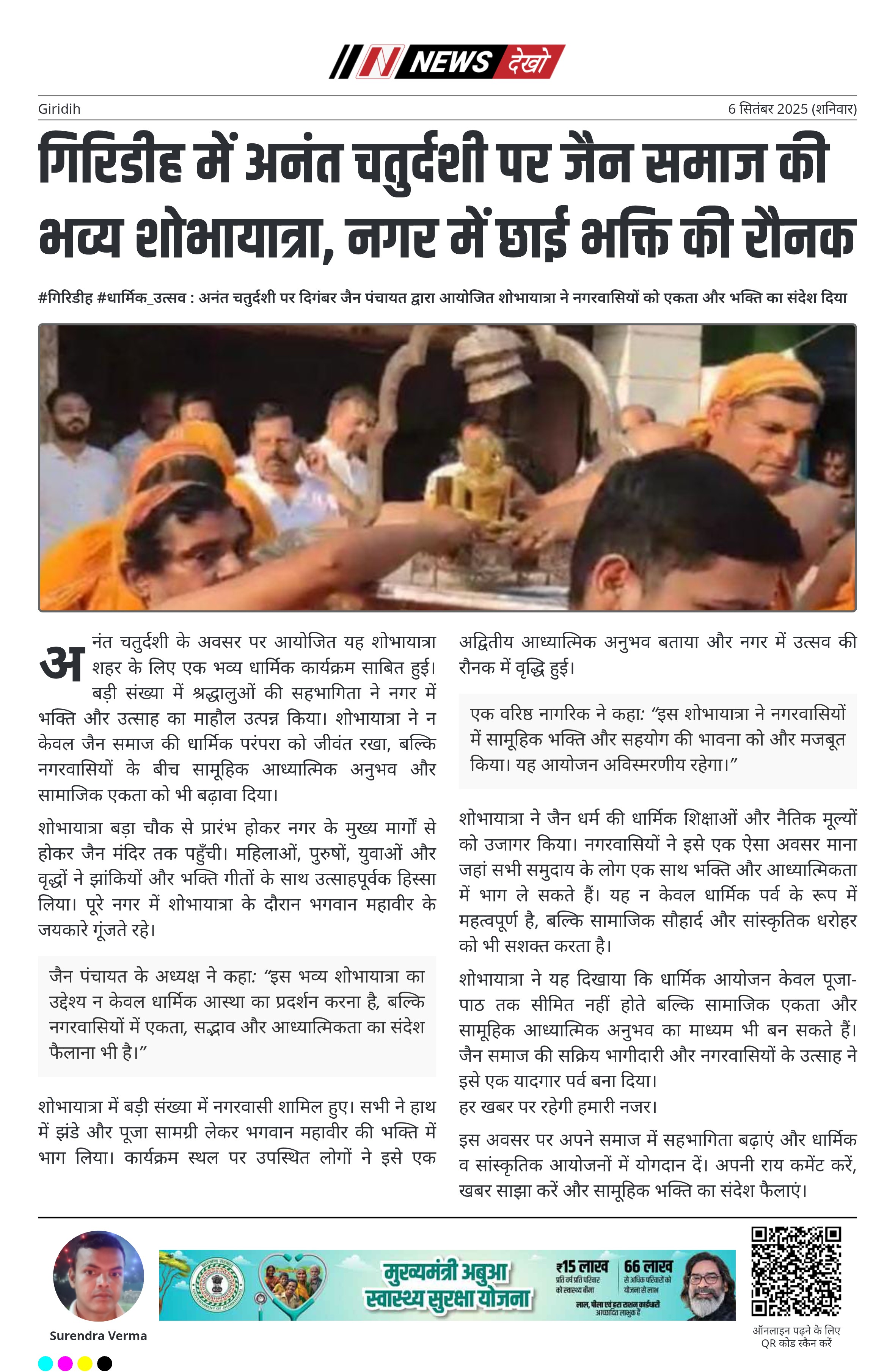 #गिरिडीह #धार्मिक_उत्सव : अनंत चतुर्दशी पर दिगंबर जैन पंचायत द्वारा आयोजित शोभायात्रा ने नगरवासियों को एकता और भक्ति का संदेश दिया