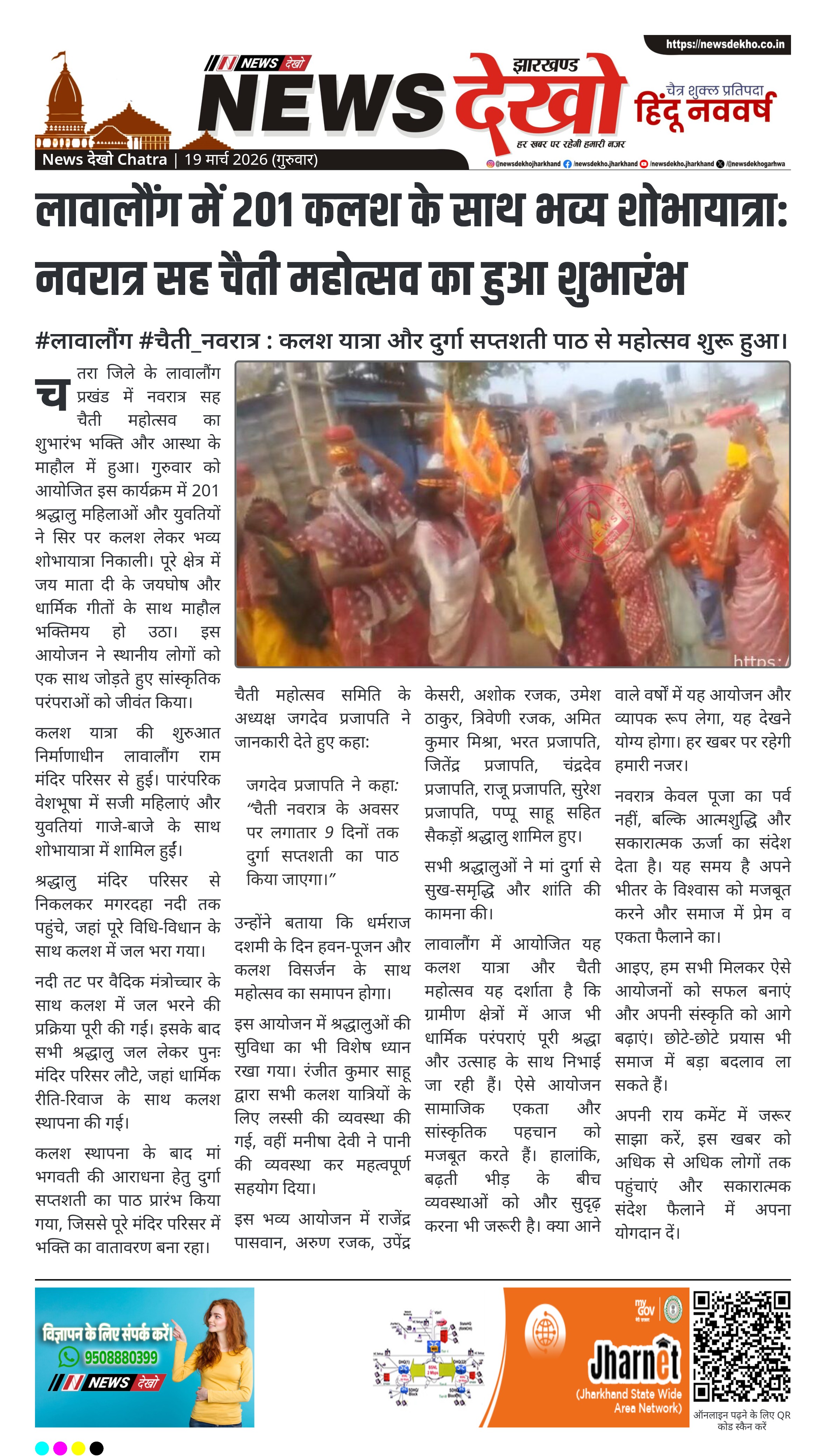 चतरा जिले के लावालौंग प्रखंड में नवरात्र सह चैती महोत्सव का शुभारंभ भक्ति और आस्था के माहौल में हुआ। गुरुवार को आयोजित इस कार्यक्रम में 201 श्रद्धालु महिलाओं और युवतियों ने सिर पर कलश लेकर भव्य शोभायात्रा निकाली। पूरे क्षेत्र में जय माता दी के जयघोष और धार्मिक गीतों के साथ माहौल भक्तिमय हो उठा। इस आयोजन ने स्थानीय लोगों को एक साथ जोड़ते हुए सांस्कृतिक परंपराओं को जीवंत किया।
