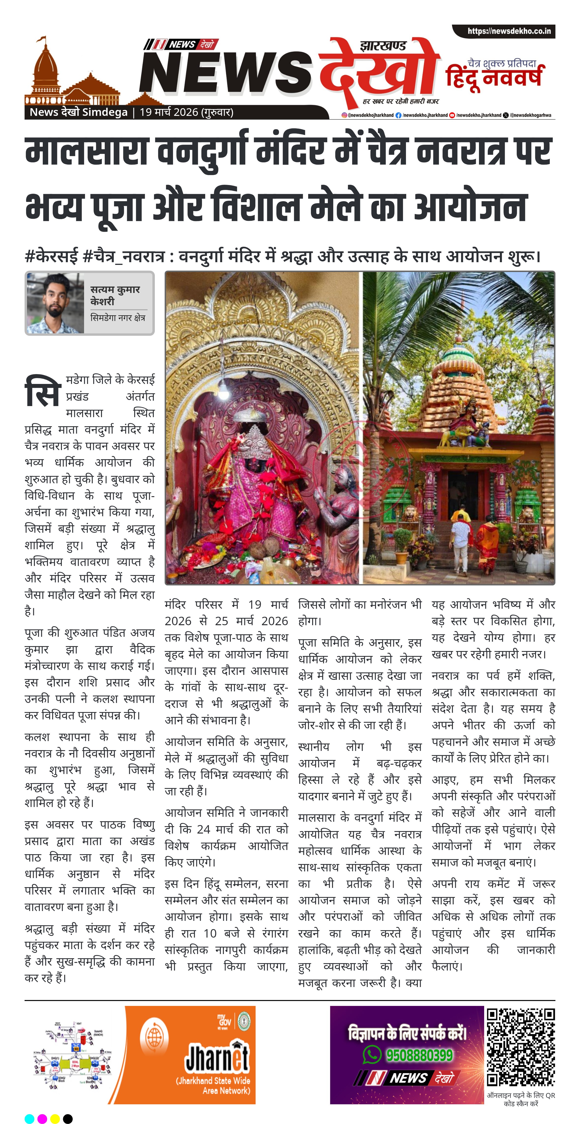 सिमडेगा जिले के केरसई प्रखंड के मालसारा स्थित वनदुर्गा मंदिर में चैत्र नवरात्र के अवसर पर भव्य पूजा-अर्चना और मेले का आयोजन शुरू हुआ। 19 मार्च से शुरू हुए इस धार्मिक आयोजन में विशेष पूजा-पाठ और अखंड पाठ किया जा रहा है। 25 मार्च तक चलने वाले इस कार्यक्रम में बड़ी संख्या में श्रद्धालुओं के पहुंचने की संभावना है। आयोजन को लेकर क्षेत्र में उत्साह का माहौल है।