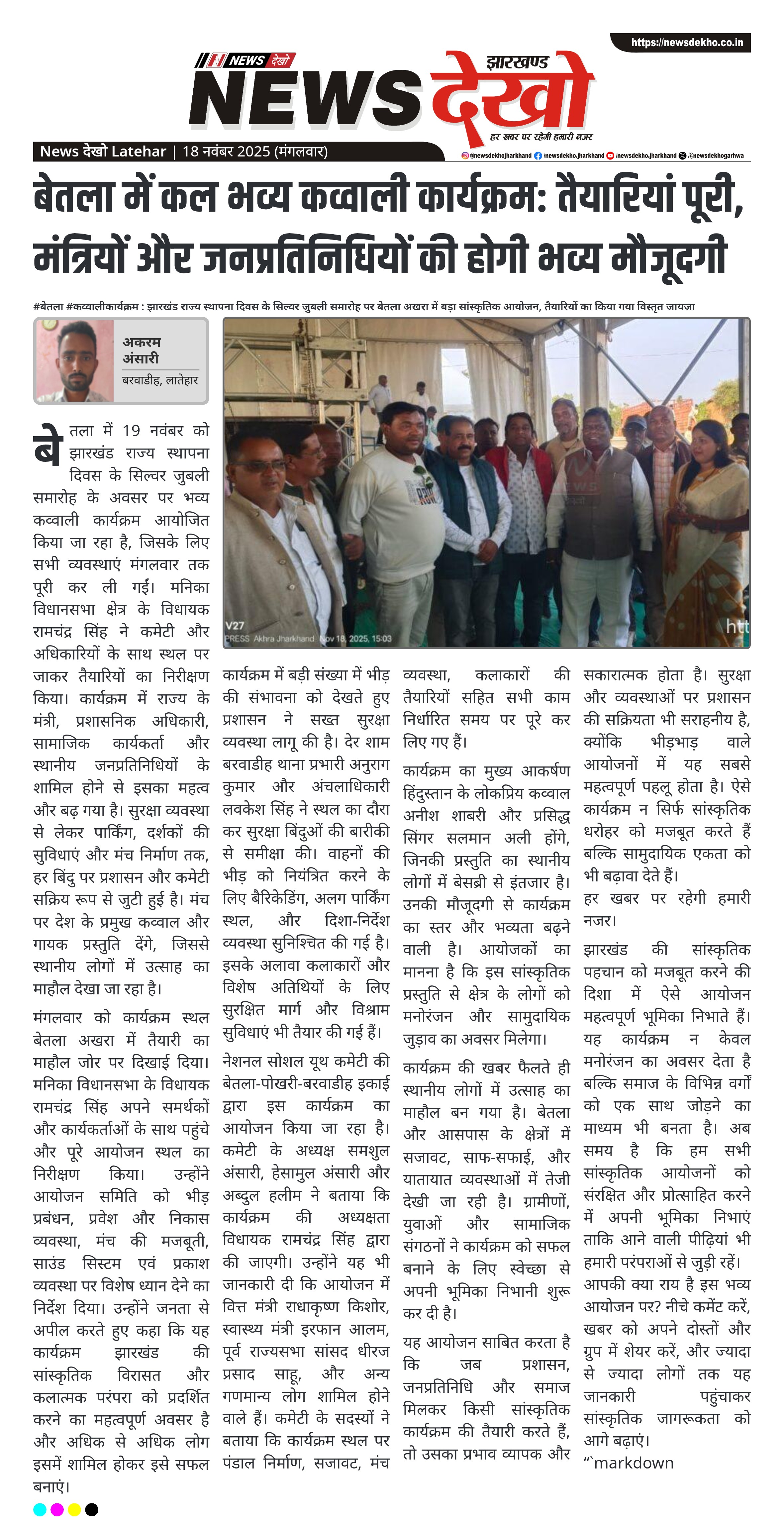 - बेतला अखरा में 19 नवंबर को आयोजित होने वाला भव्य कव्वाली कार्यक्रम पूरी तरह तैयार।
