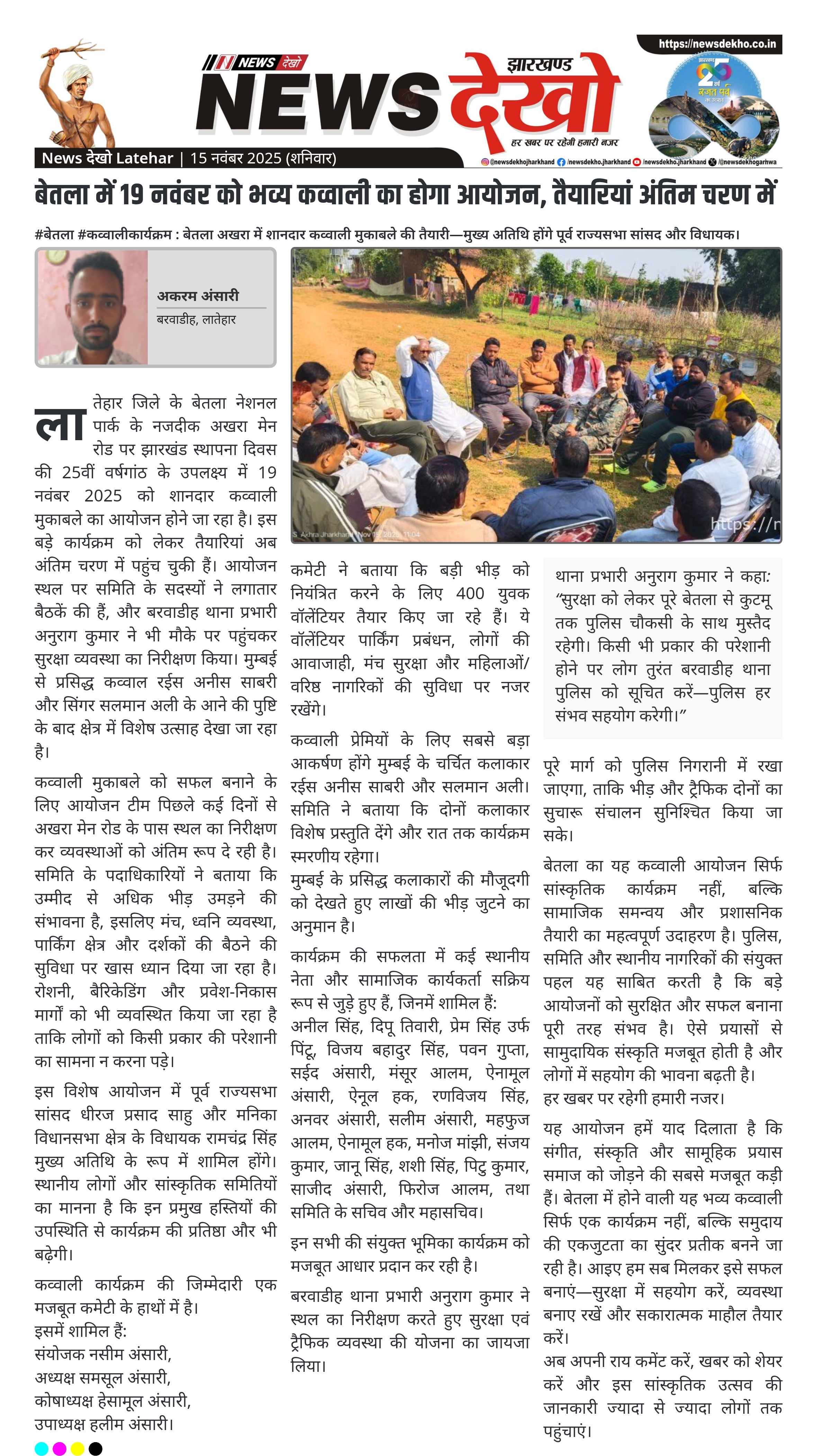 लातेहार जिले के बेतला नेशनल पार्क के नजदीक अखरा मेन रोड पर झारखंड स्थापना दिवस की 25वीं वर्षगांठ के उपलक्ष्य में 19 नवंबर 2025 को शानदार कव्वाली मुकाबले का आयोजन होने जा रहा है। इस बड़े कार्यक्रम को लेकर तैयारियां अब अंतिम चरण में पहुंच चुकी हैं। आयोजन स्थल पर समिति के सदस्यों ने लगातार बैठकें की हैं, और बरवाडीह थाना प्रभारी अनुराग कुमार ने भी मौके पर पहुंचकर सुरक्षा व्यवस्था का निरीक्षण किया। मुम्बई से प्रसिद्ध कव्वाल रईस अनीस साबरी और सिंगर सलमान अली के आने की पुष्टि के बाद क्षेत्र में विशेष उत्साह देखा जा रहा है।
