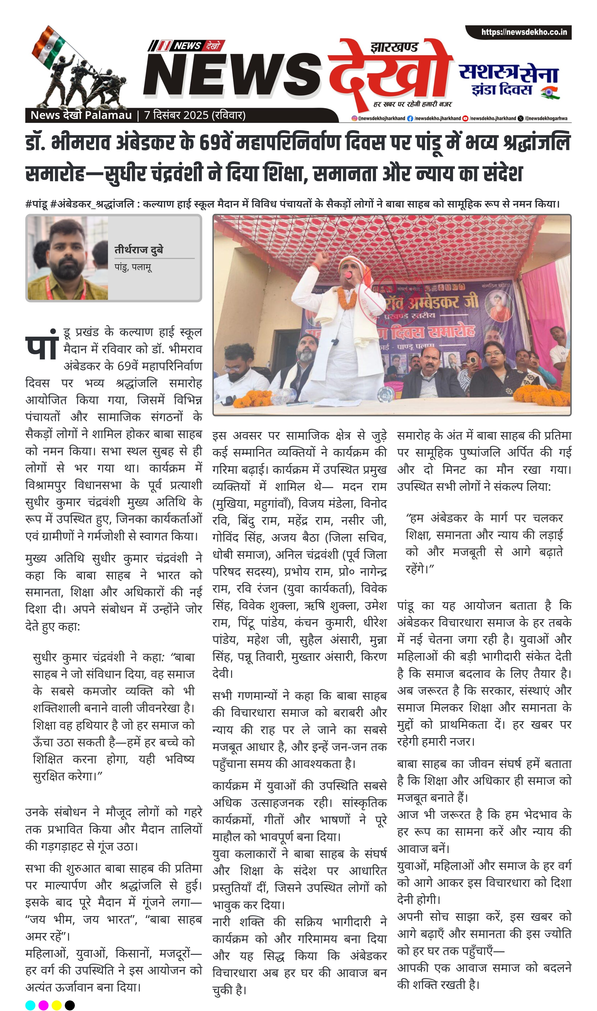 पांडू प्रखंड के कल्याण हाई स्कूल मैदान में रविवार को डॉ. भीमराव अंबेडकर के 69वें महापरिनिर्वाण दिवस पर भव्य श्रद्धांजलि समारोह आयोजित किया गया, जिसमें विभिन्न पंचायतों और सामाजिक संगठनों के सैकड़ों लोगों ने शामिल होकर बाबा साहब को नमन किया। सभा स्थल सुबह से ही लोगों से भर गया था। कार्यक्रम में विश्रामपुर विधानसभा के पूर्व प्रत्याशी सुधीर कुमार चंद्रवंशी मुख्य अतिथि के रूप में उपस्थित हुए, जिनका कार्यकर्ताओं एवं ग्रामीणों ने गर्मजोशी से स्वागत किया।
