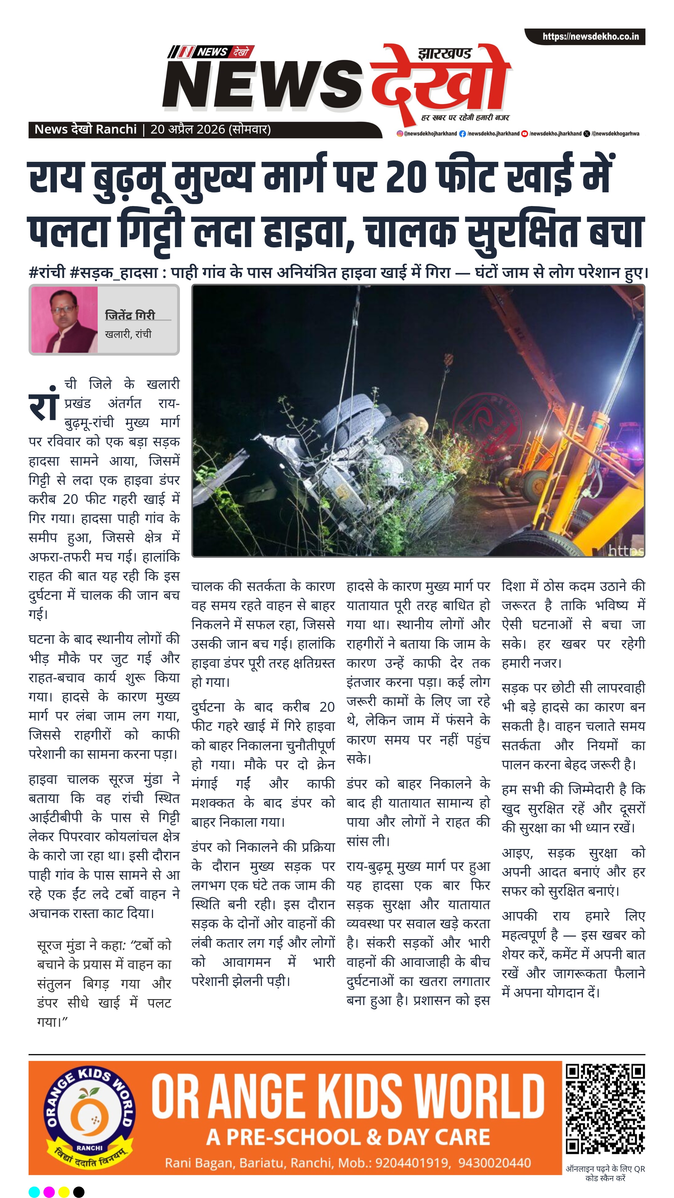 - गिट्टी लदा हाइवा (जेएच02एन-7546) करीब 20 फीट खाई में गिरा।