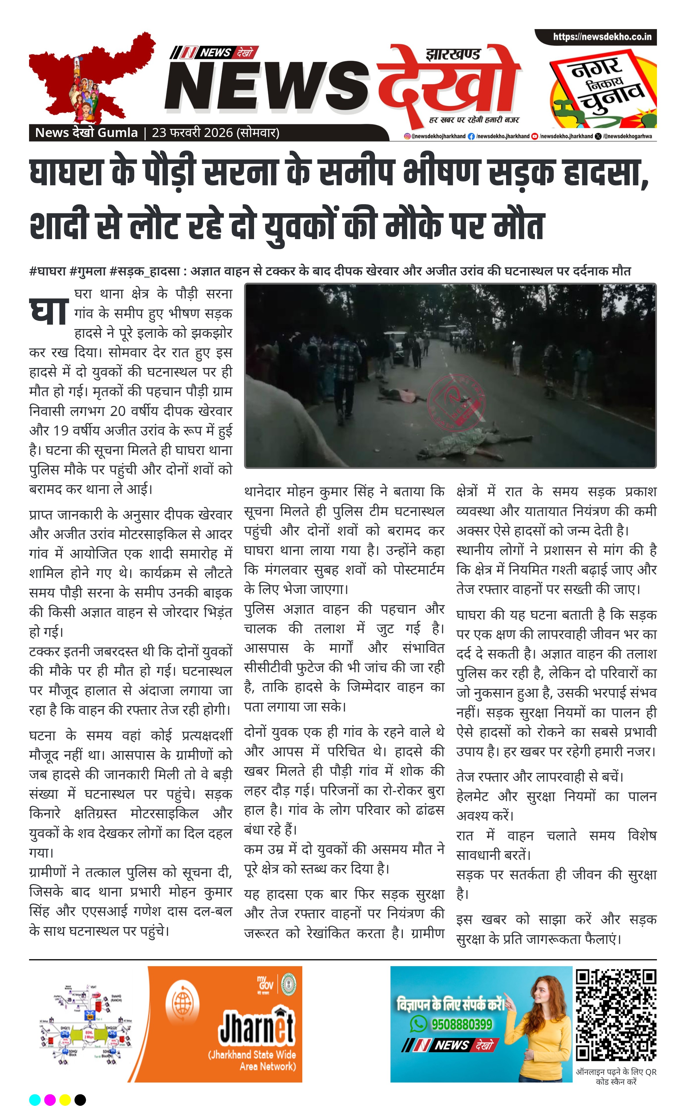 #घाघरा #गुमला #सड़क_हादसा : अज्ञात वाहन से टक्कर के बाद दीपक खेरवार और अजीत उरांव की घटनास्थल पर दर्दनाक मौत