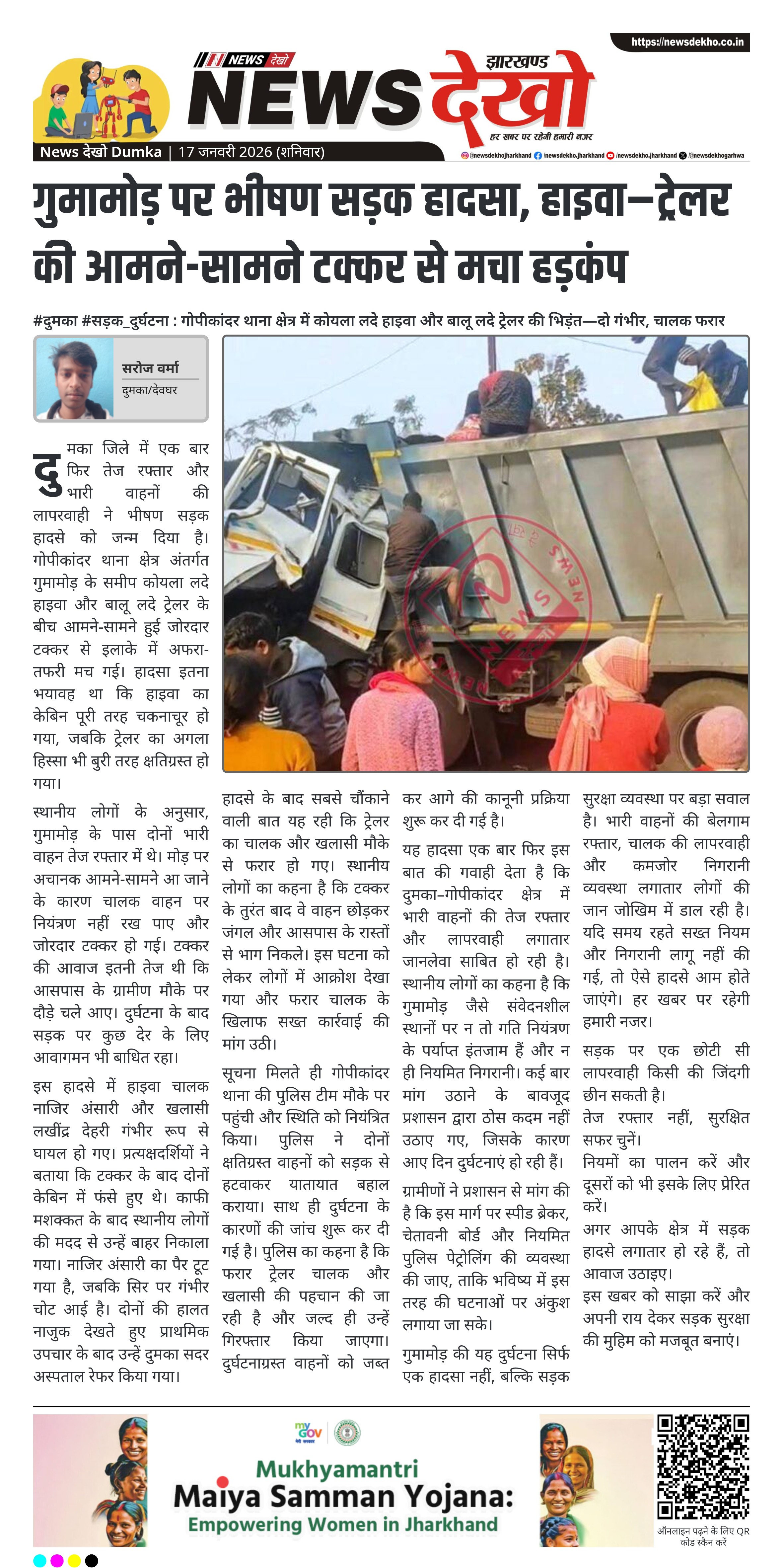 #दुमका #सड़क_दुर्घटना : गोपीकांदर थाना क्षेत्र में कोयला लदे हाइवा और बालू लदे ट्रेलर की भिड़ंत—दो गंभीर, चालक फरार