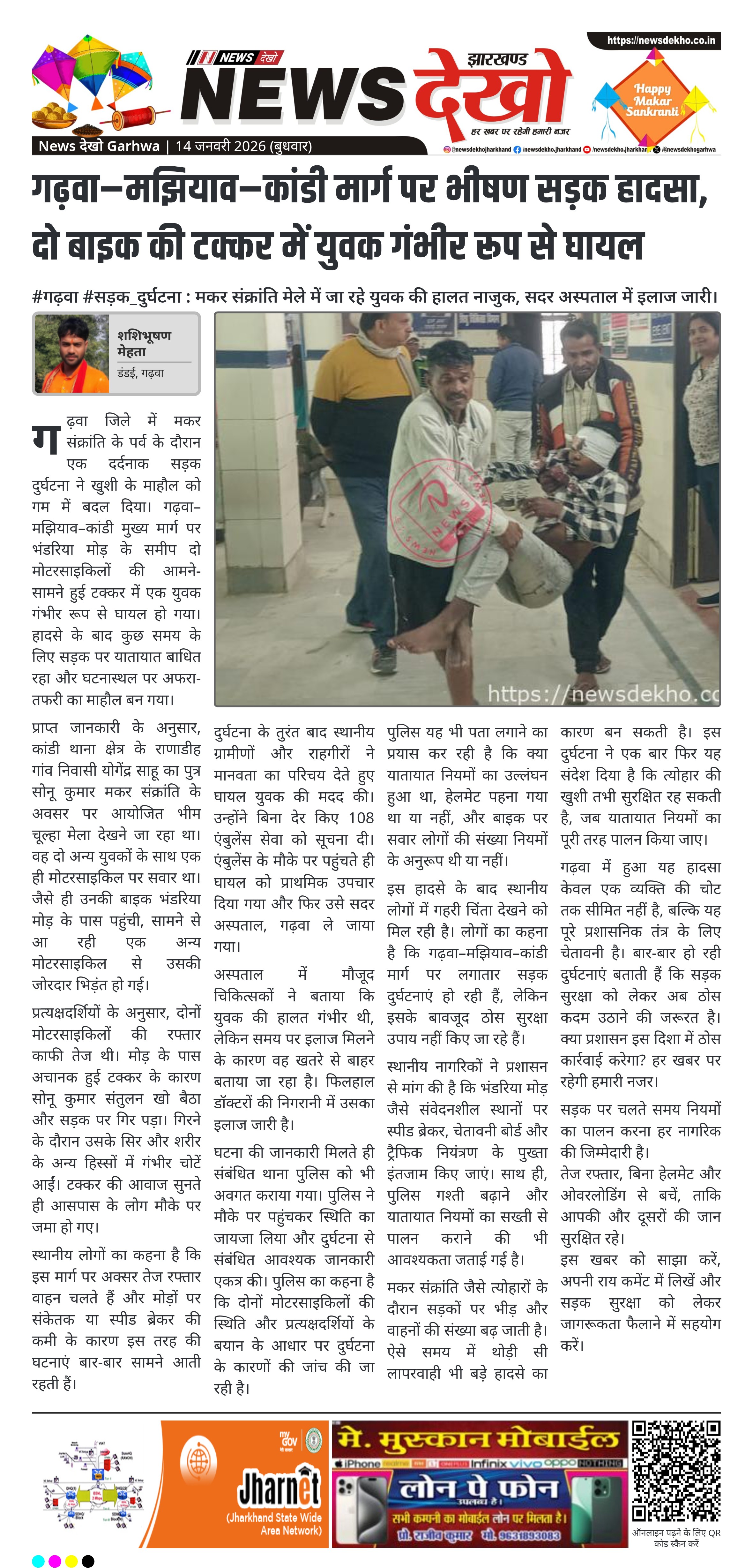 गढ़वा जिले में मकर संक्रांति के पर्व के दौरान एक दर्दनाक सड़क दुर्घटना ने खुशी के माहौल को गम में बदल दिया। गढ़वा–मझियाव–कांडी मुख्य मार्ग पर भंडरिया मोड़ के समीप दो मोटरसाइकिलों की आमने-सामने हुई टक्कर में एक युवक गंभीर रूप से घायल हो गया। हादसे के बाद कुछ समय के लिए सड़क पर यातायात बाधित रहा और घटनास्थल पर अफरा-तफरी का माहौल बन गया।