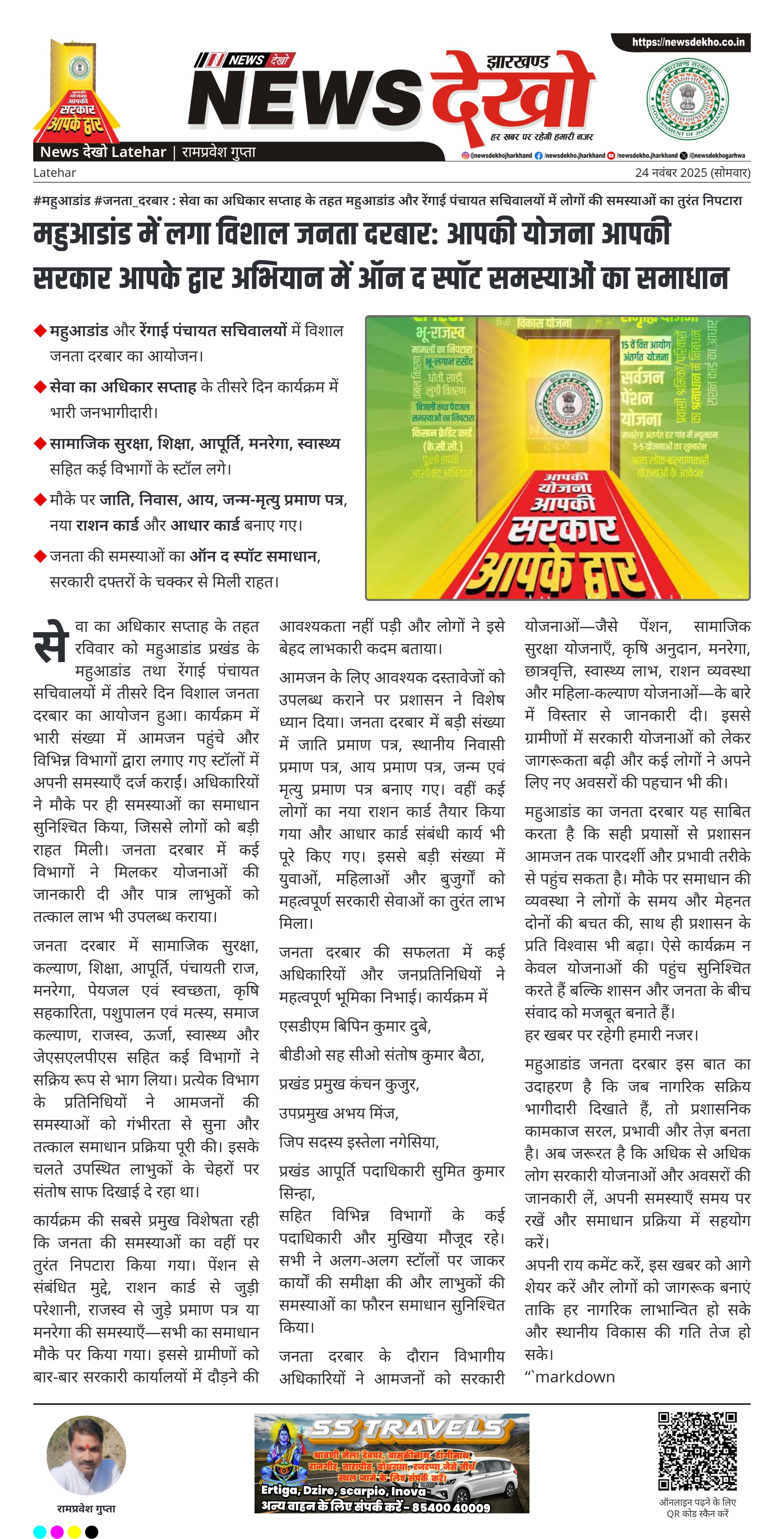 महुआडांड जनता दरबार इस बात का उदाहरण है कि जब नागरिक सक्रिय भागीदारी दिखाते हैं, तो प्रशासनिक कामकाज सरल, प्रभावी और तेज़ बनता है। अब जरूरत है कि अधिक से अधिक लोग सरकारी योजनाओं और अवसरों की जानकारी लें, अपनी समस्याएँ समय पर रखें और समाधान प्रक्रिया में सहयोग करें।
