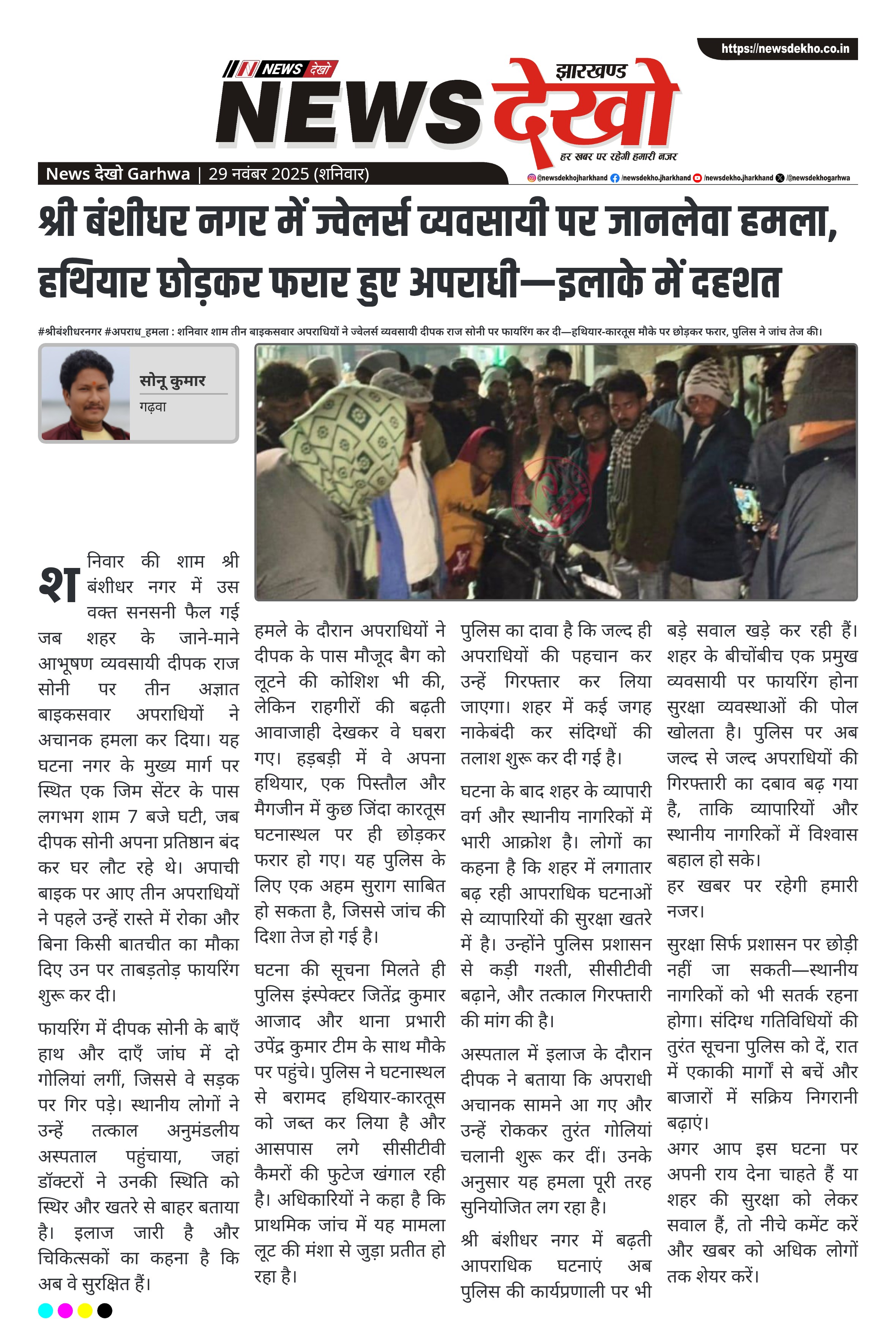शनिवार की शाम श्री बंशीधर नगर में उस वक्त सनसनी फैल गई जब शहर के जाने-माने आभूषण व्यवसायी दीपक राज सोनी पर तीन अज्ञात बाइकसवार अपराधियों ने अचानक हमला कर दिया। यह घटना नगर के मुख्य मार्ग पर स्थित एक जिम सेंटर के पास लगभग शाम 7 बजे घटी, जब दीपक सोनी अपना प्रतिष्ठान बंद कर घर लौट रहे थे। अपाची बाइक पर आए तीन अपराधियों ने पहले उन्हें रास्ते में रोका और बिना किसी बातचीत का मौका दिए उन पर ताबड़तोड़ फायरिंग शुरू कर दी।