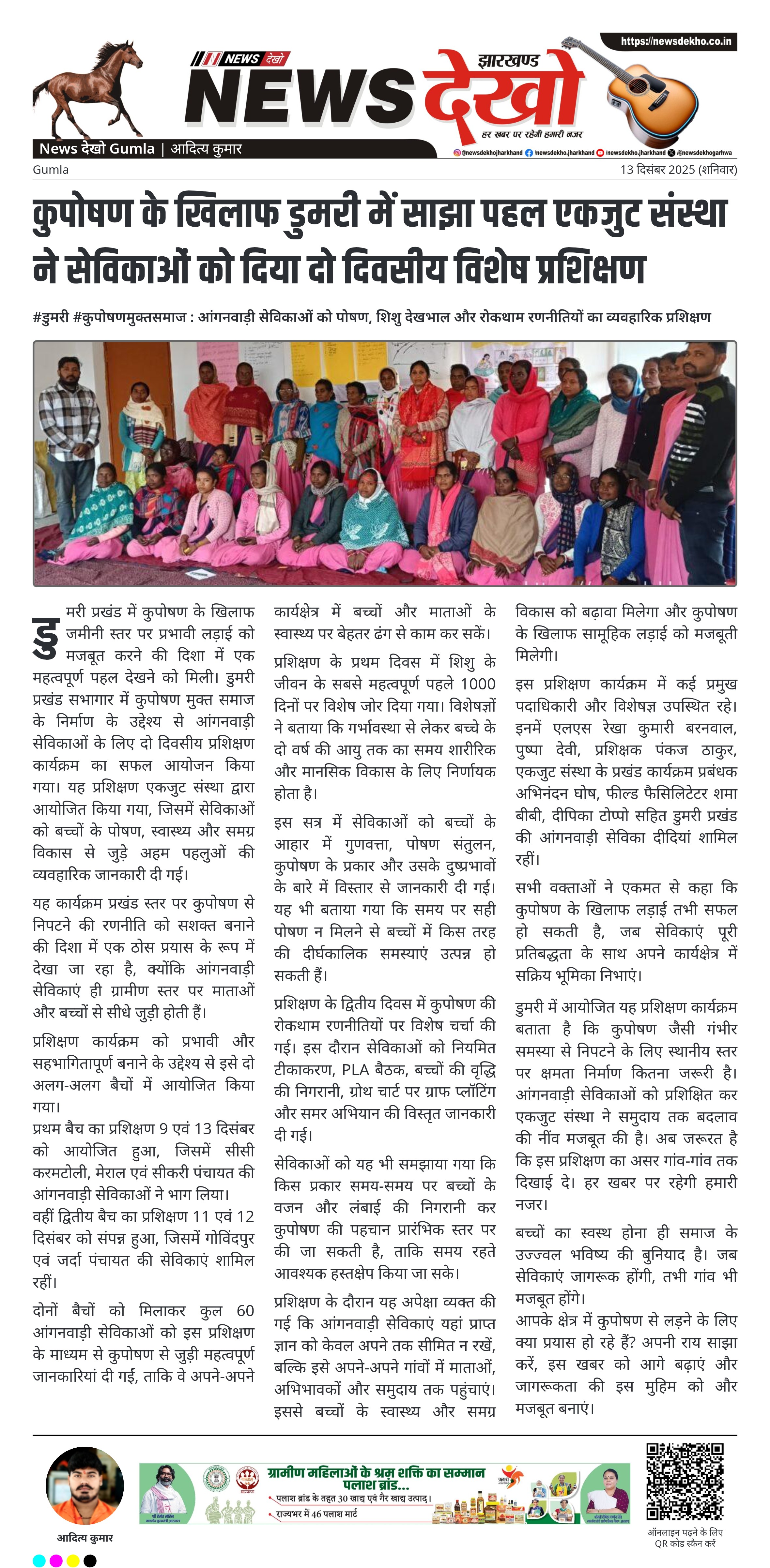 डुमरी में आयोजित यह प्रशिक्षण कार्यक्रम बताता है कि कुपोषण जैसी गंभीर समस्या से निपटने के लिए स्थानीय स्तर पर क्षमता निर्माण कितना जरूरी है। आंगनवाड़ी सेविकाओं को प्रशिक्षित कर एकजुट संस्था ने समुदाय तक बदलाव की नींव मजबूत की है। अब जरूरत है कि इस प्रशिक्षण का असर गांव-गांव तक दिखाई दे। हर खबर पर रहेगी हमारी नजर।