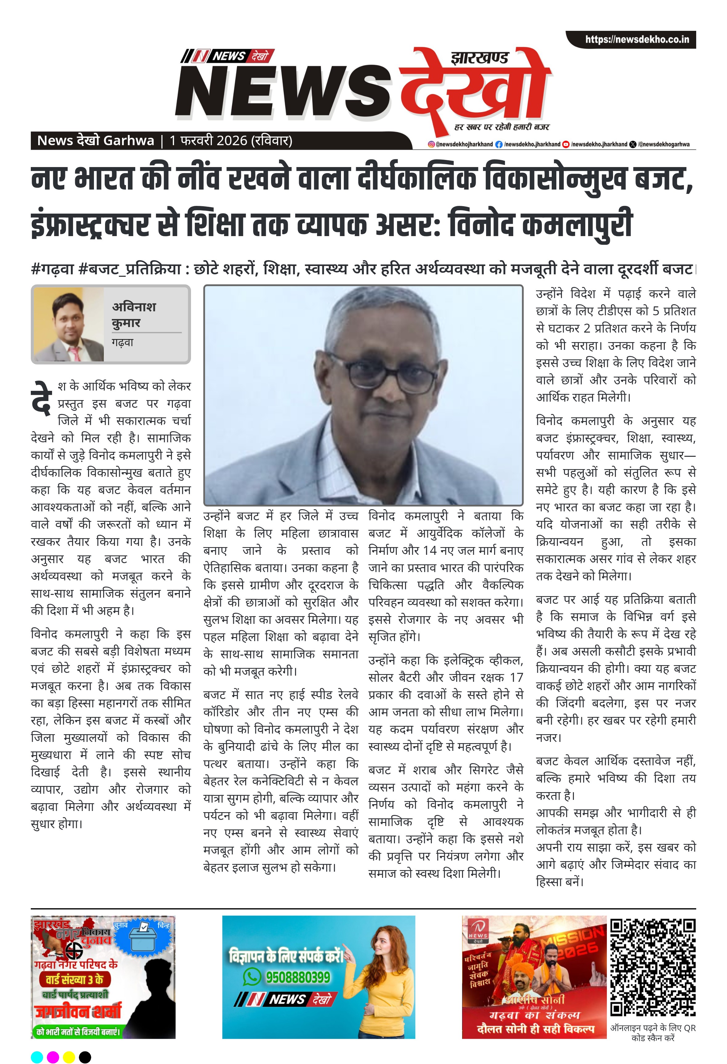 #गढ़वा #बजट_प्रतिक्रिया : छोटे शहरों, शिक्षा, स्वास्थ्य और हरित अर्थव्यवस्था को मजबूती देने वाला दूरदर्शी बजट।