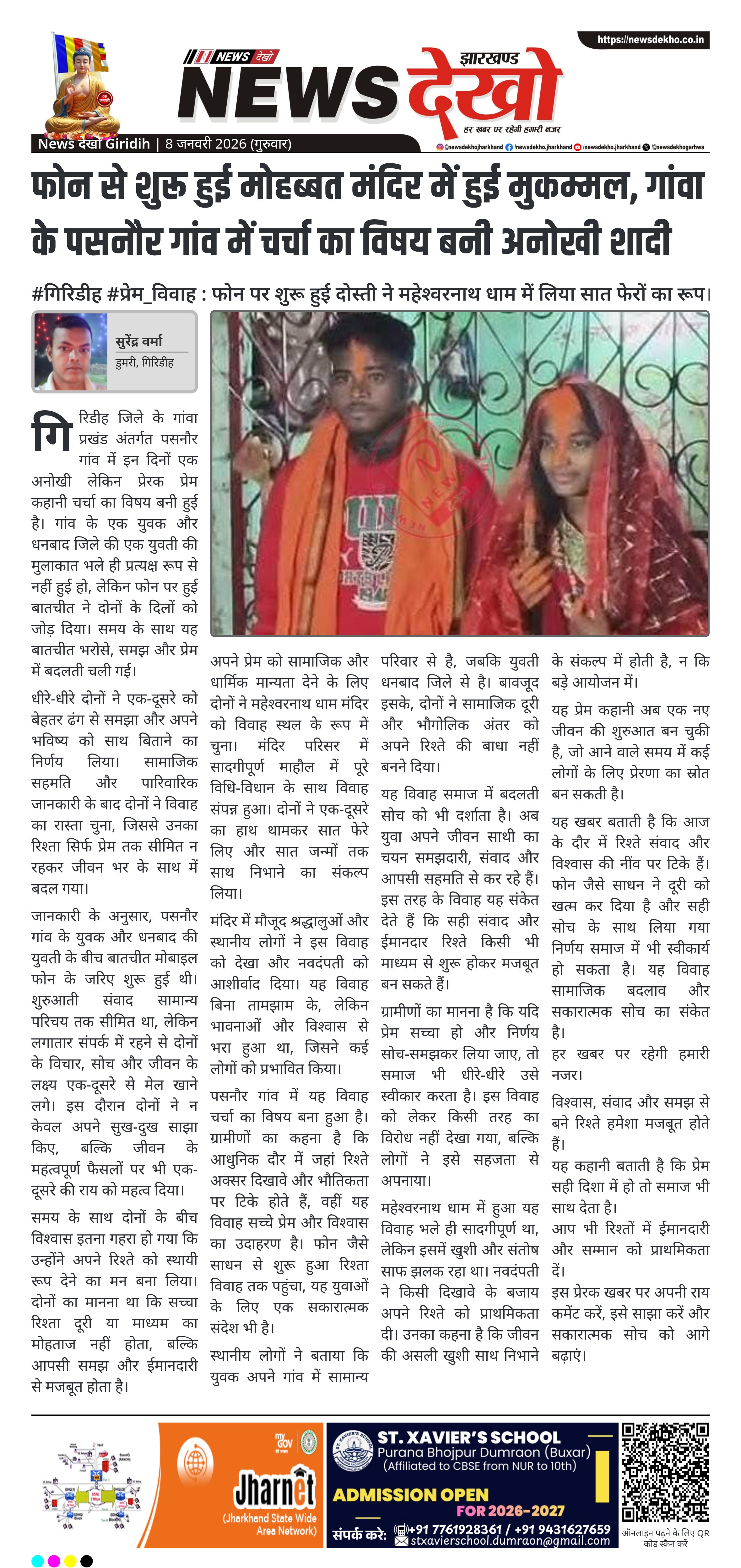 गिरिडीह जिले के गांवा प्रखंड अंतर्गत पसनौर गांव के एक युवक और धनबाद की युवती की प्रेम कहानी ने विवाह का रूप ले लिया है। दोनों की पहचान और बातचीत फोन के माध्यम से शुरू हुई थी, जो समय के साथ गहरे विश्वास और प्रेम में बदल गई। आपसी सहमति के बाद दोनों ने महेश्वरनाथ धाम मंदिर में विधि-विधान से विवाह कर अपने रिश्ते को सामाजिक मान्यता दी। यह विवाह सादगी, विश्वास और आधुनिक दौर की प्रेम कहानी का उदाहरण बन गया है।