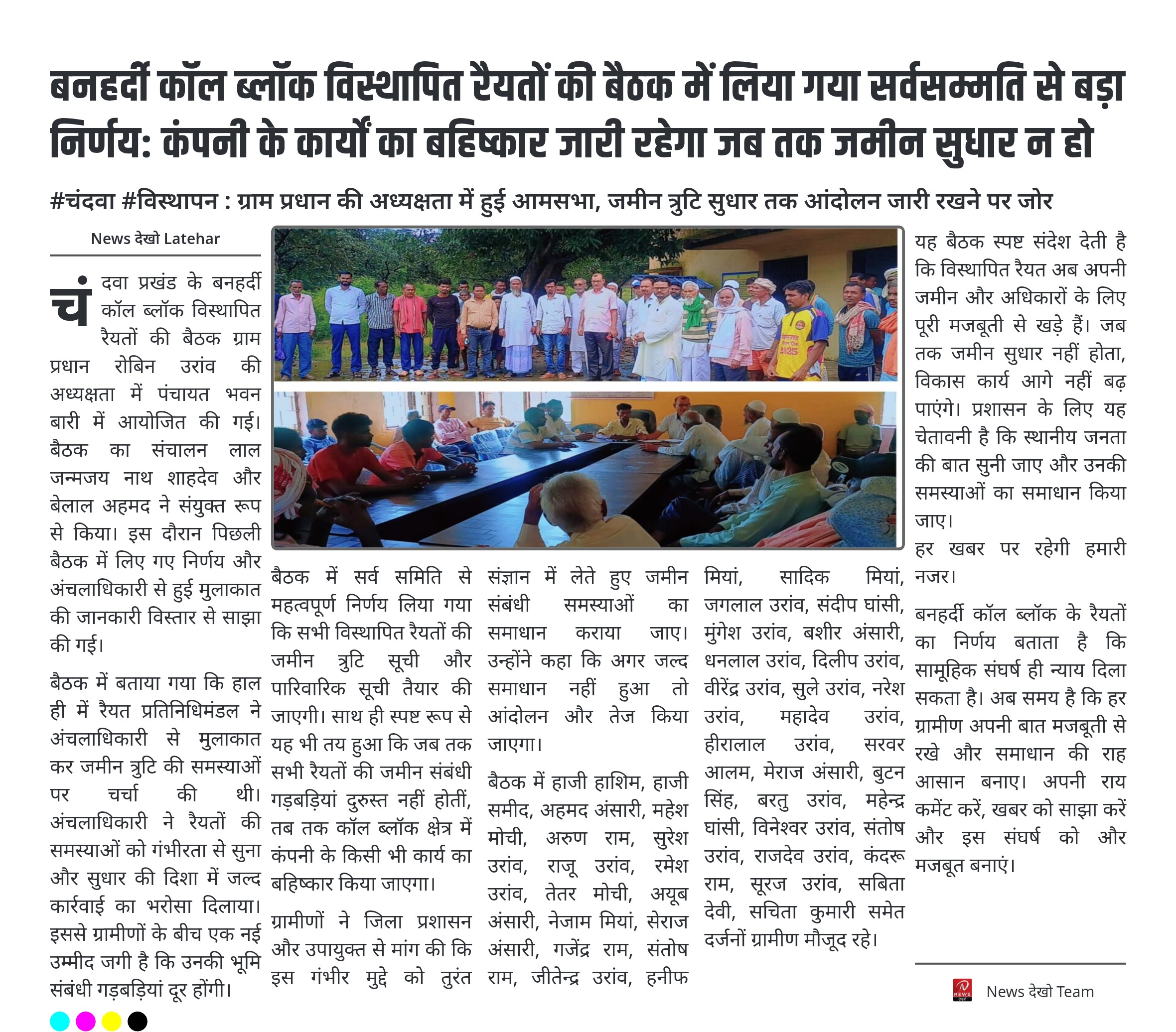 बनहर्दी कॉल ब्लॉक विस्थापित रैयतों की बैठक में लिया गया सर्वसम्मति से बड़ा निर्णय: कंपनी के कार्यों का बहिष्कार जारी रहेगा जब तक जमीन सुधार न हो