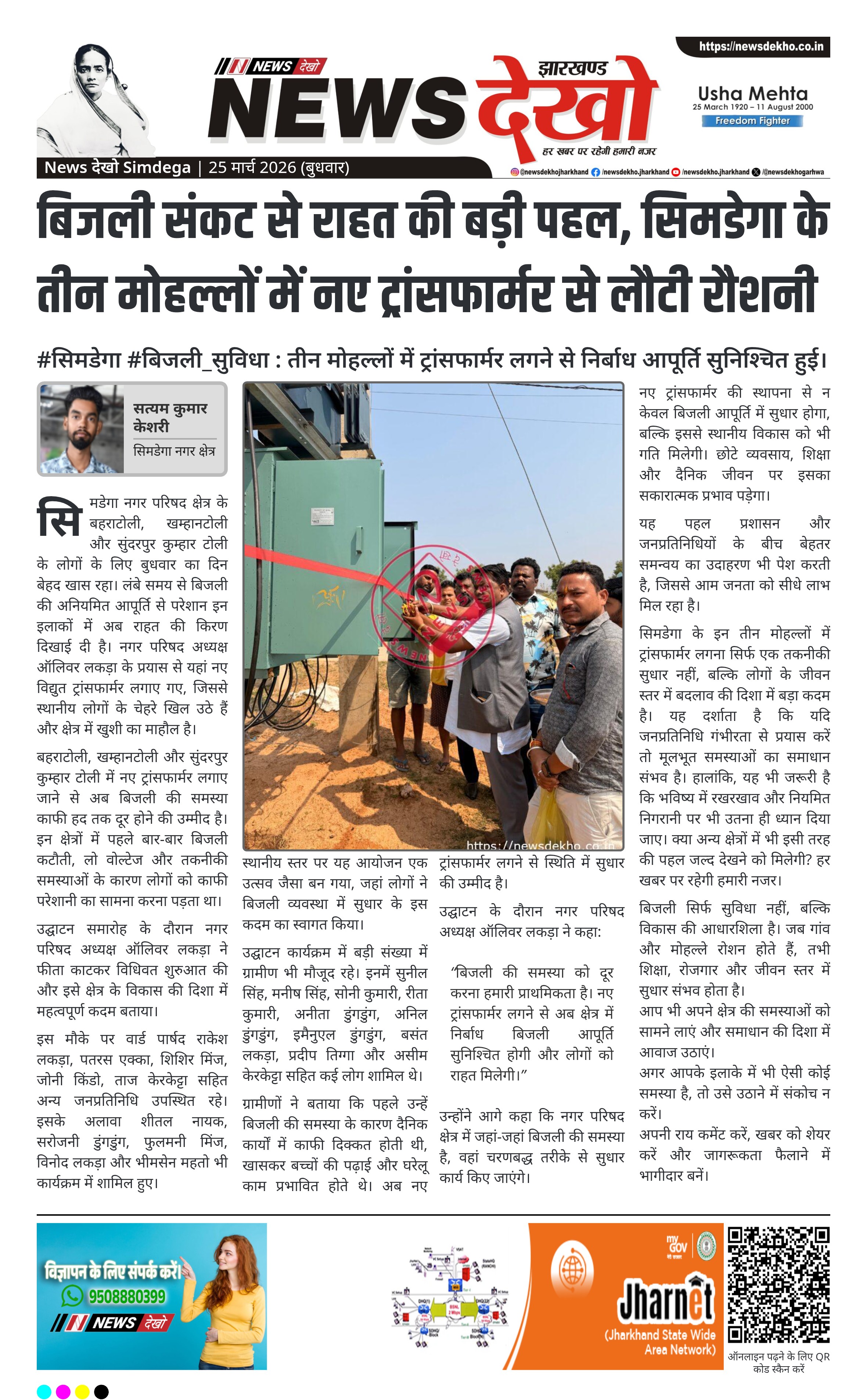 • सिमडेगा नगर परिषद क्षेत्र के तीन मोहल्लों में नए ट्रांसफार्मर लगाए गए।