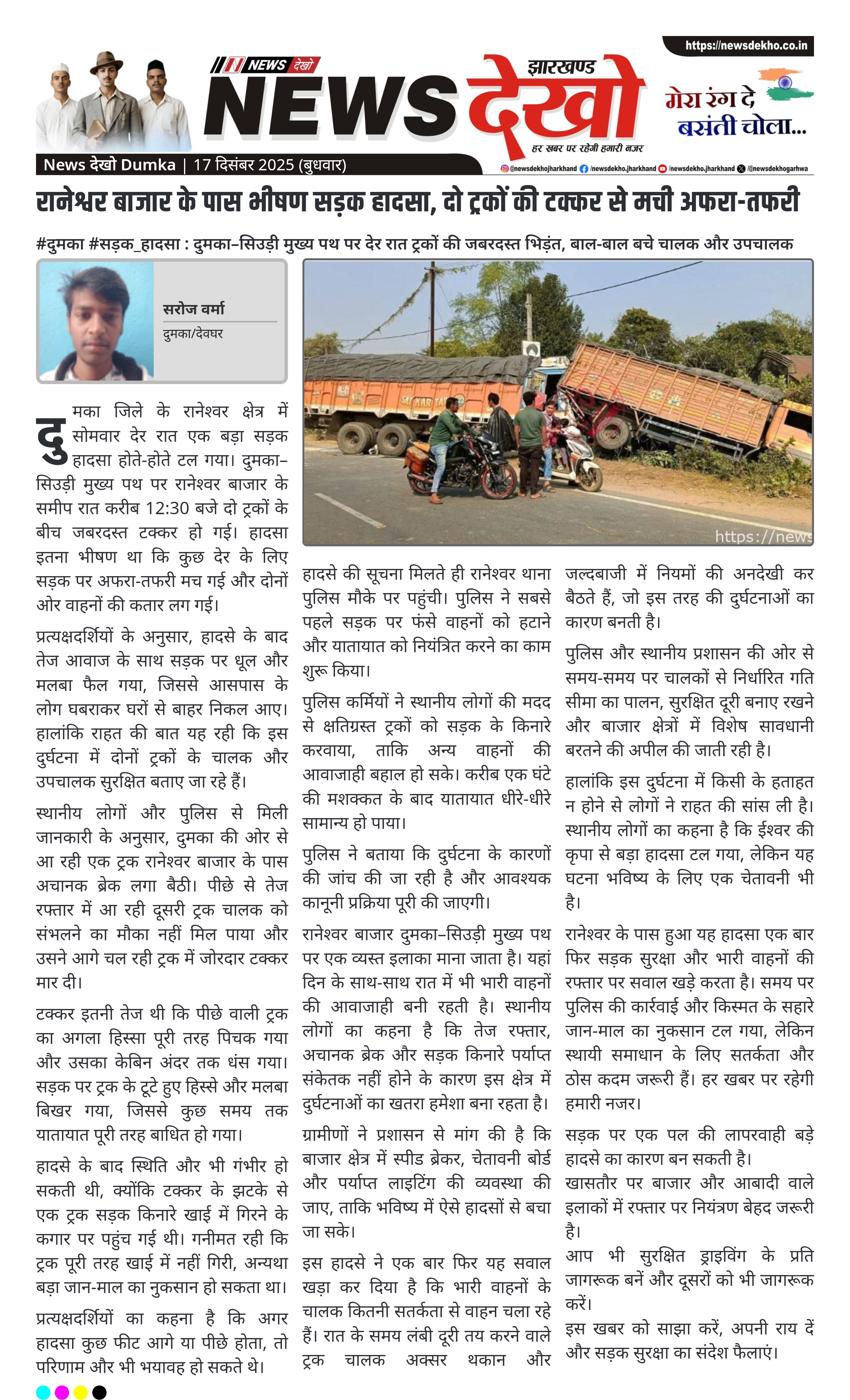 दुमका जिले के रानेश्वर क्षेत्र में सोमवार देर रात एक बड़ा सड़क हादसा होते-होते टल गया। दुमका–सिउड़ी मुख्य पथ पर रानेश्वर बाजार के समीप रात करीब 12:30 बजे दो ट्रकों के बीच जबरदस्त टक्कर हो गई। हादसा इतना भीषण था कि कुछ देर के लिए सड़क पर अफरा-तफरी मच गई और दोनों ओर वाहनों की कतार लग गई।