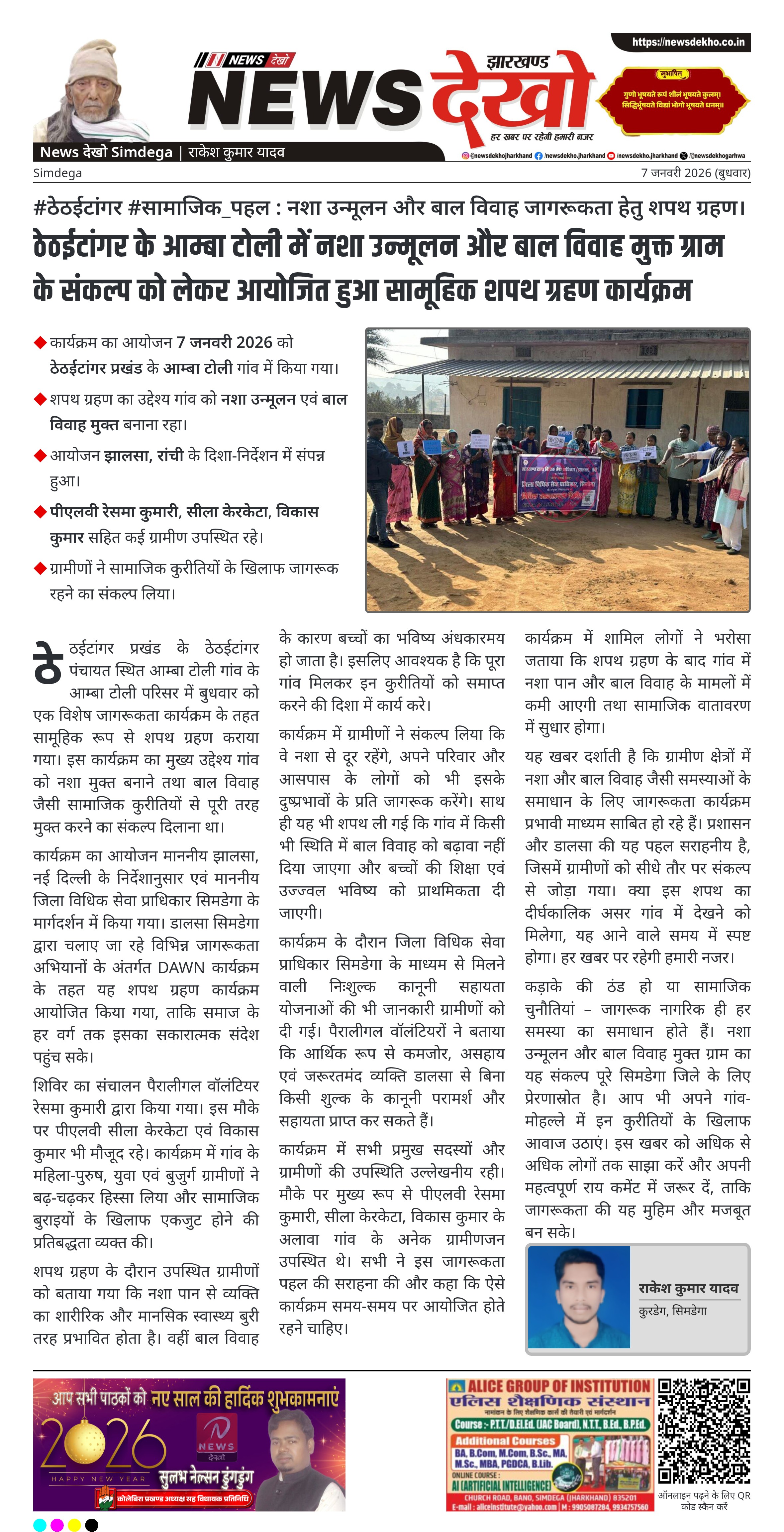 सिमडेगा जिला अंतर्गत ठेठईटांगर प्रखंड के आम्बा टोली गांव में 7 जनवरी 2026 को नशा उन्मूलन और बाल विवाह मुक्त ग्राम बनाने के उद्देश्य से शपथ ग्रहण कार्यक्रम आयोजित किया गया। यह आयोजन झालसा के निर्देश और जिला विधिक सेवा प्राधिकार सिमडेगा के मार्गदर्शन में संपन्न हुआ। कार्यक्रम में पैरालीगल वॉलंटियर और बड़ी संख्या में ग्रामीण शामिल हुए। सामाजिक जागरूकता की दृष्टि से यह पहल महत्वपूर्ण मानी जा रही है।