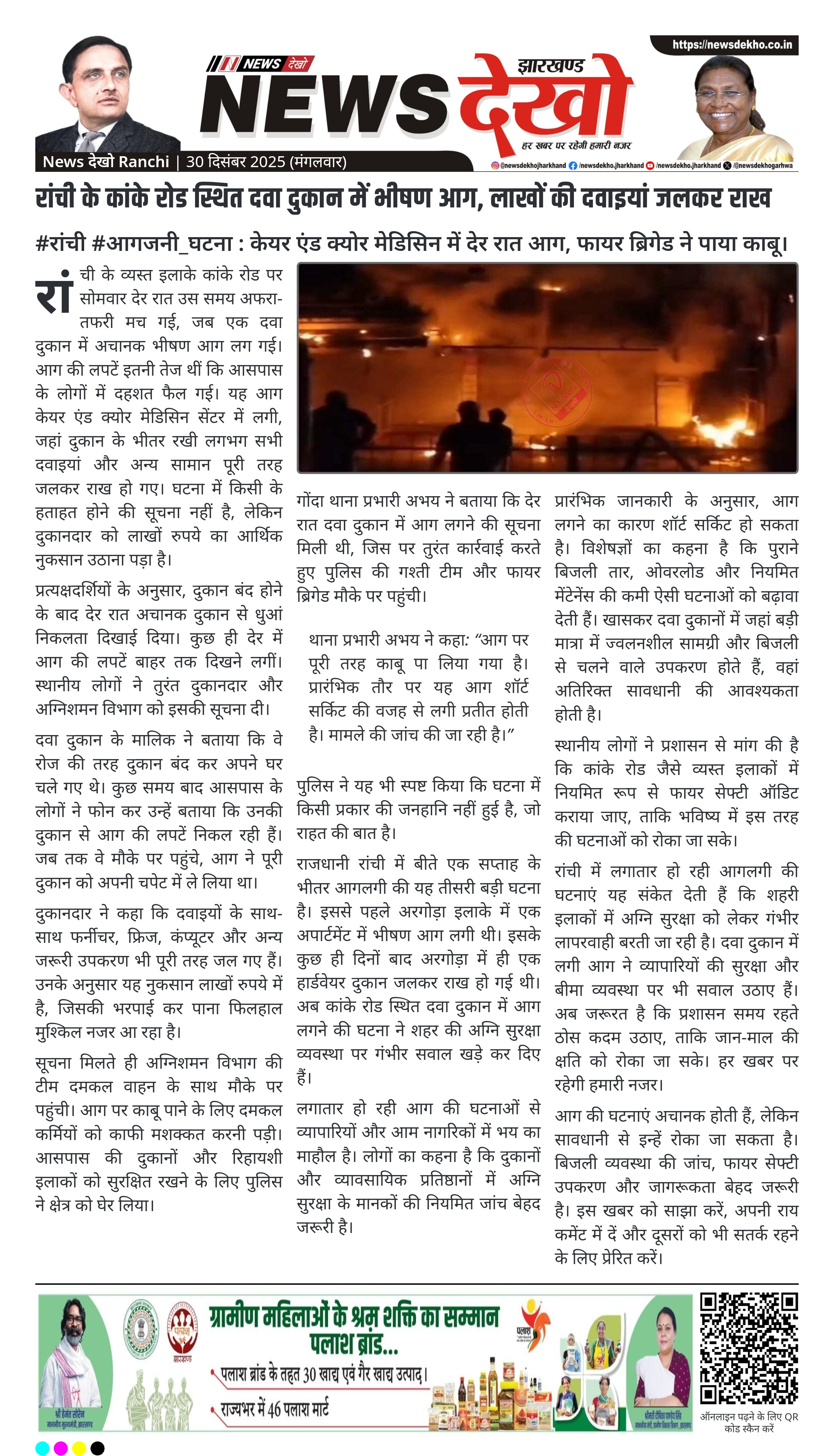 - कांके रोड, रांची स्थित केयर एंड क्योर मेडिसिन सेंटर में देर रात आग।