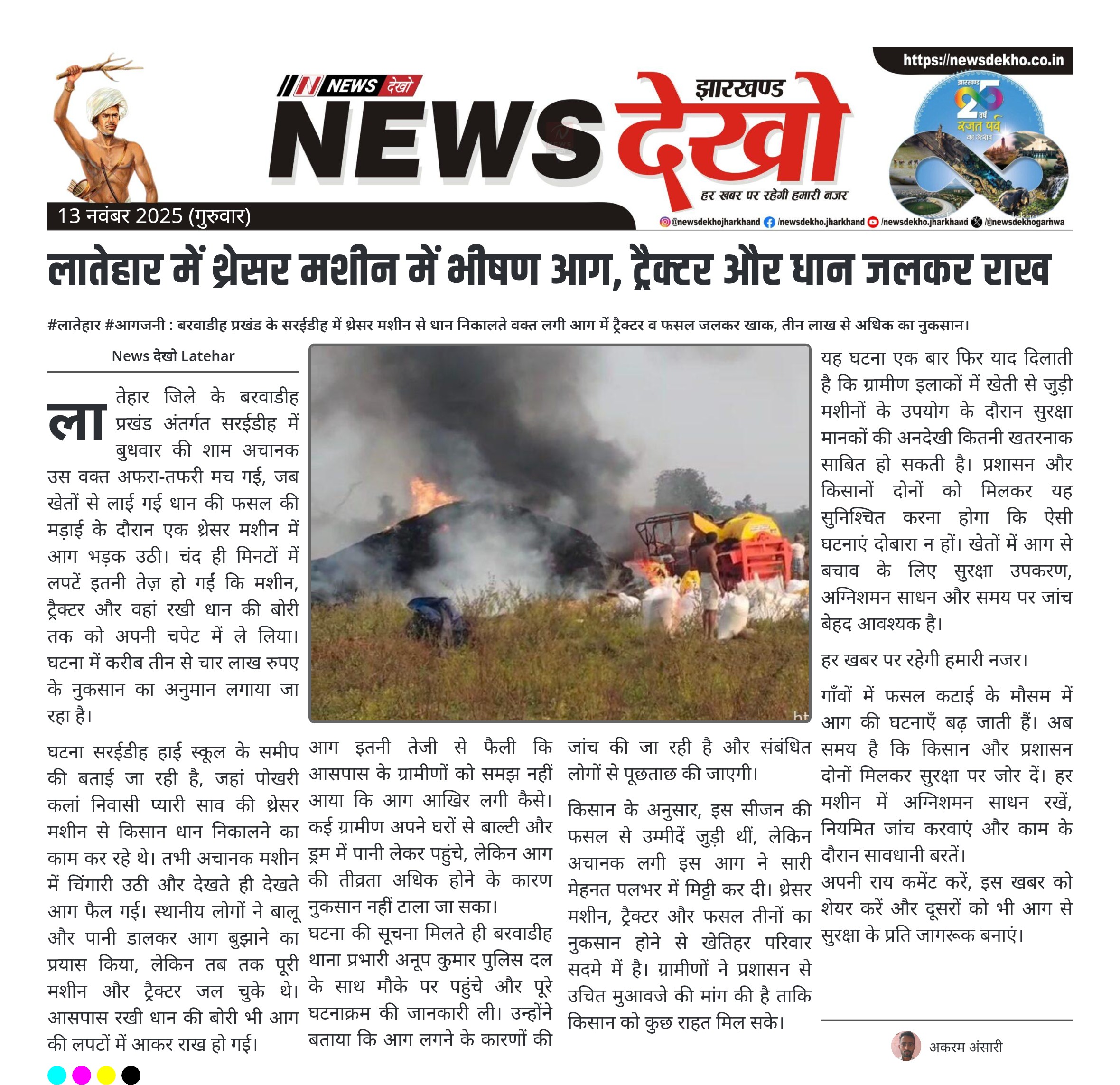 लातेहार जिले के बरवाडीह प्रखंड अंतर्गत सरईडीह में बुधवार की शाम अचानक उस वक्त अफरा-तफरी मच गई, जब खेतों से लाई गई धान की फसल की मड़ाई के दौरान एक थ्रेसर मशीन में आग भड़क उठी। चंद ही मिनटों में लपटें इतनी तेज़ हो गईं कि मशीन, ट्रैक्टर और वहां रखी धान की बोरी तक को अपनी चपेट में ले लिया। घटना में करीब तीन से चार लाख रुपए के नुकसान का अनुमान लगाया जा रहा है।