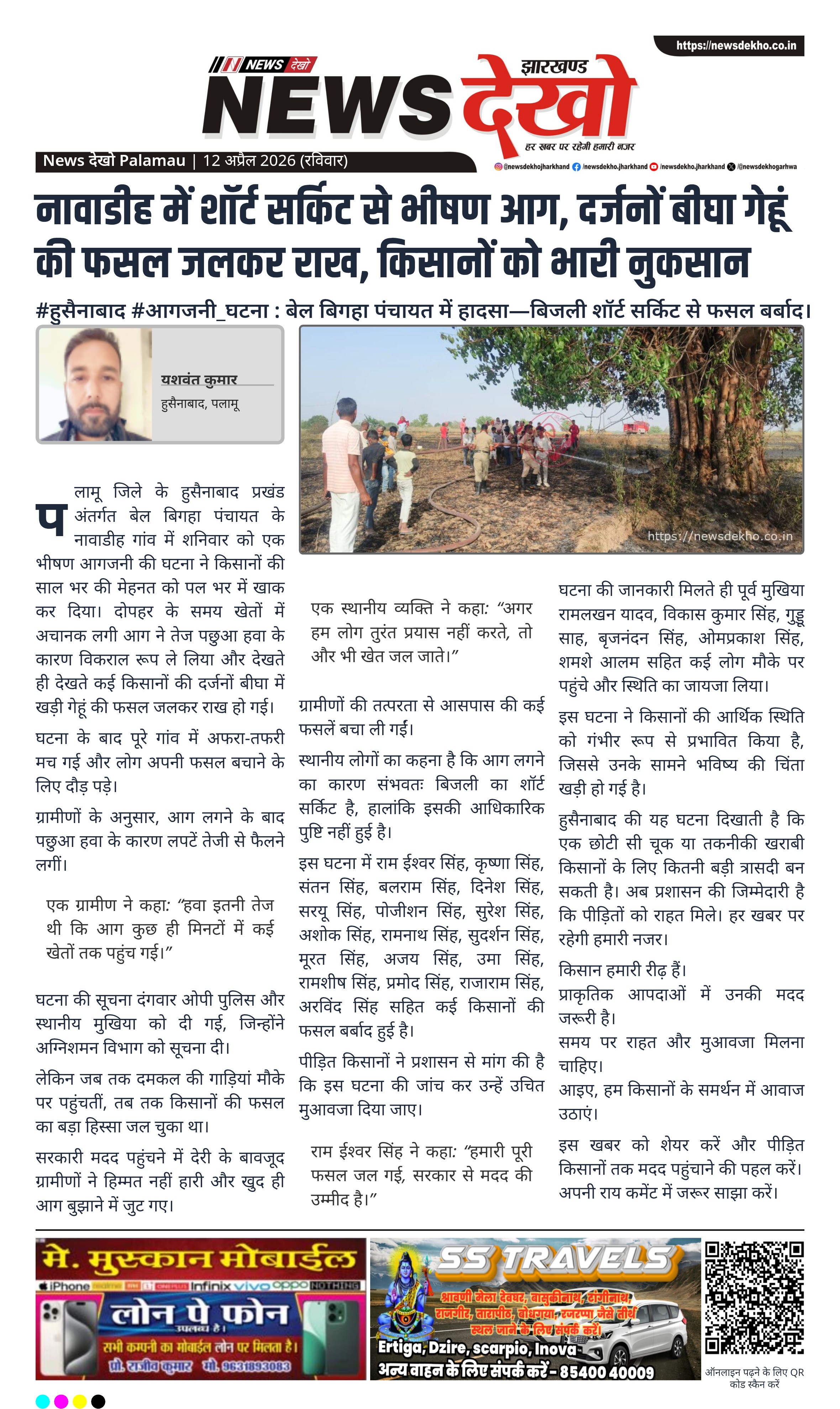 पलामू जिले के हुसैनाबाद प्रखंड अंतर्गत बेल बिगहा पंचायत के नावाडीह गांव में शनिवार को एक भीषण आगजनी की घटना ने किसानों की साल भर की मेहनत को पल भर में खाक कर दिया। दोपहर के समय खेतों में अचानक लगी आग ने तेज पछुआ हवा के कारण विकराल रूप ले लिया और देखते ही देखते कई किसानों की दर्जनों बीघा में खड़ी गेहूं की फसल जलकर राख हो गई।