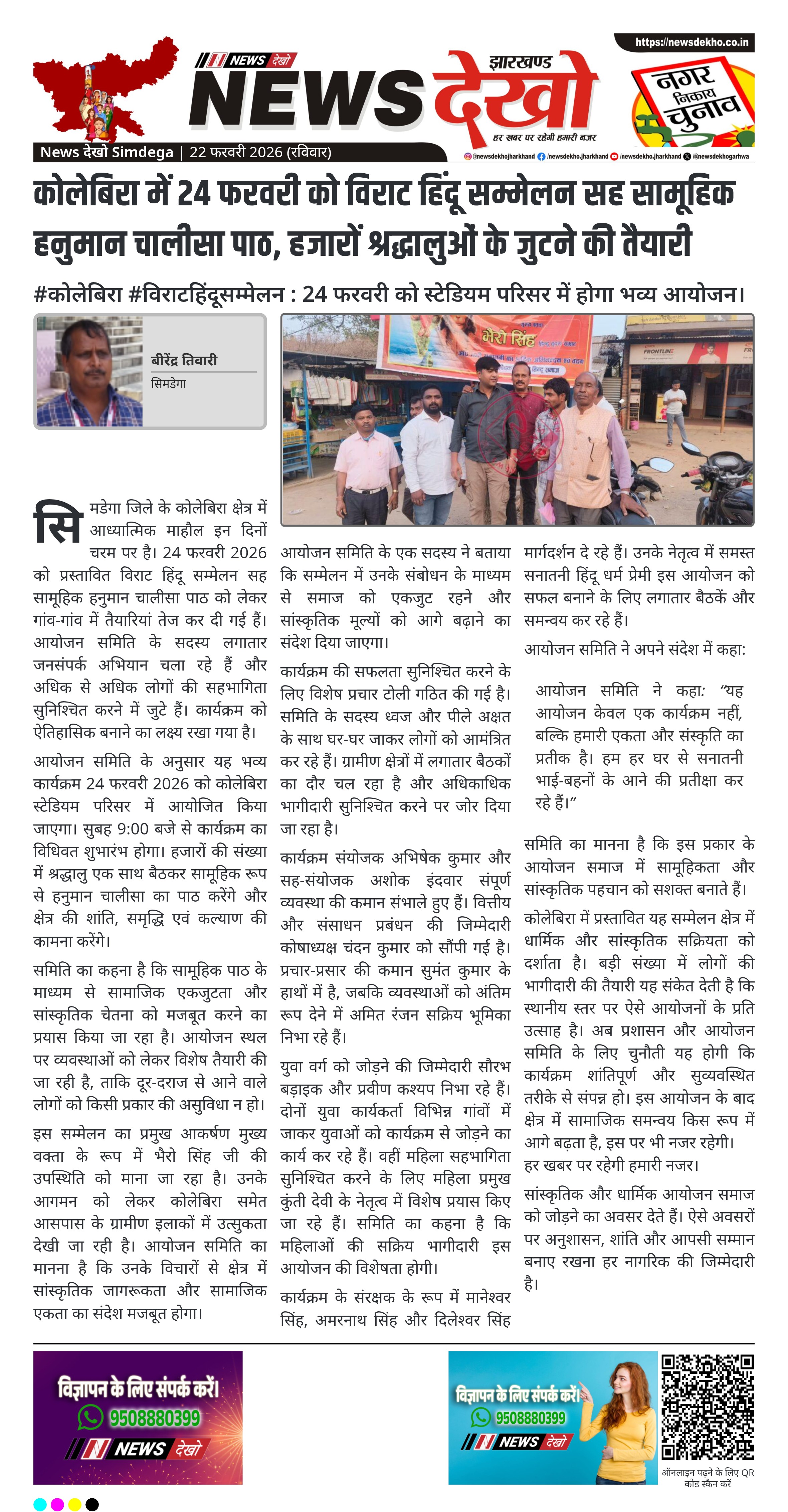 सिमडेगा जिले के कोलेबिरा क्षेत्र में आध्यात्मिक माहौल इन दिनों चरम पर है। 24 फरवरी 2026 को प्रस्तावित विराट हिंदू सम्मेलन सह सामूहिक हनुमान चालीसा पाठ को लेकर गांव-गांव में तैयारियां तेज कर दी गई हैं। आयोजन समिति के सदस्य लगातार जनसंपर्क अभियान चला रहे हैं और अधिक से अधिक लोगों की सहभागिता सुनिश्चित करने में जुटे हैं। कार्यक्रम को ऐतिहासिक बनाने का लक्ष्य रखा गया है।