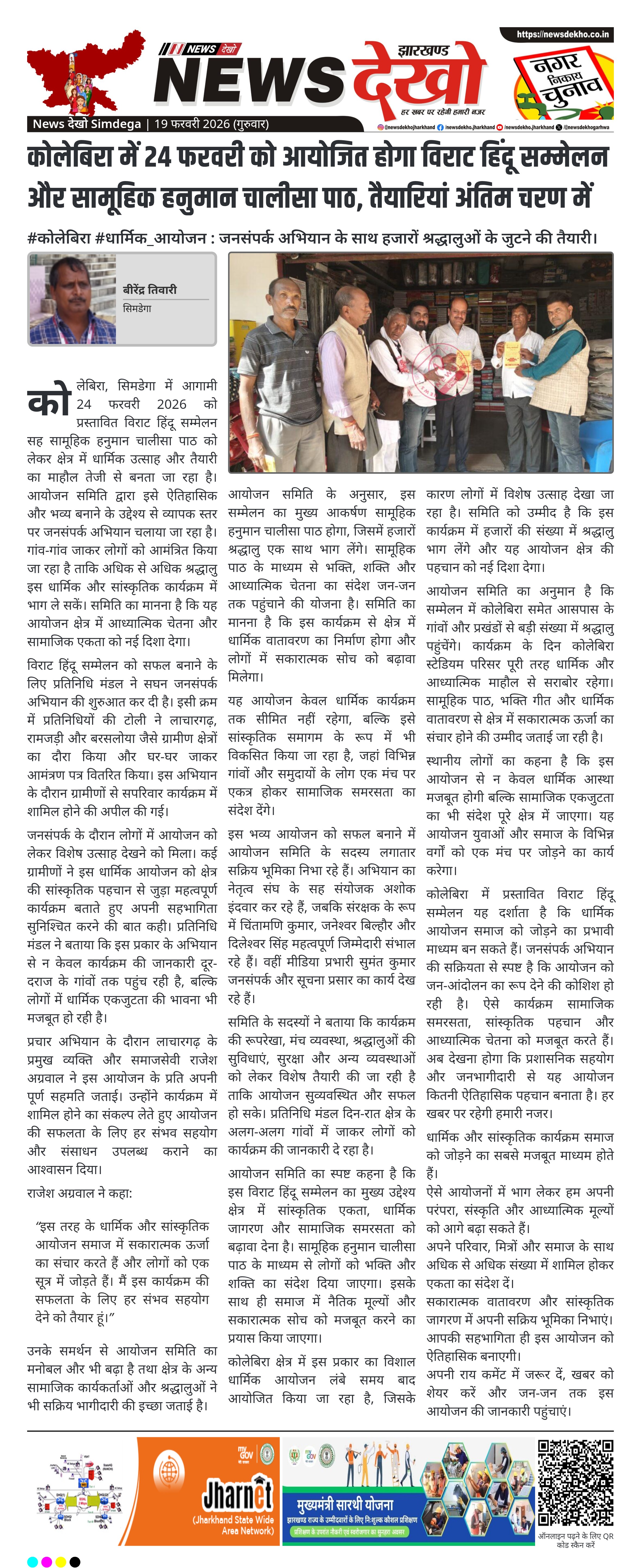 सिमडेगा जिले के कोलेबिरा स्टेडियम परिसर में 24 फरवरी 2026 को विराट हिंदू सम्मेलन सह सामूहिक हनुमान चालीसा पाठ का आयोजन प्रस्तावित है। आयोजन को सफल बनाने के लिए प्रतिनिधि मंडल द्वारा ग्रामीण क्षेत्रों में सघन जनसंपर्क अभियान चलाया जा रहा है। यह कार्यक्रम सांस्कृतिक एकता, धार्मिक जागरण और सामाजिक सहभागिता को बढ़ावा देने के उद्देश्य से आयोजित किया जा रहा है, जिसमें बड़ी संख्या में श्रद्धालुओं के शामिल होने की संभावना है।