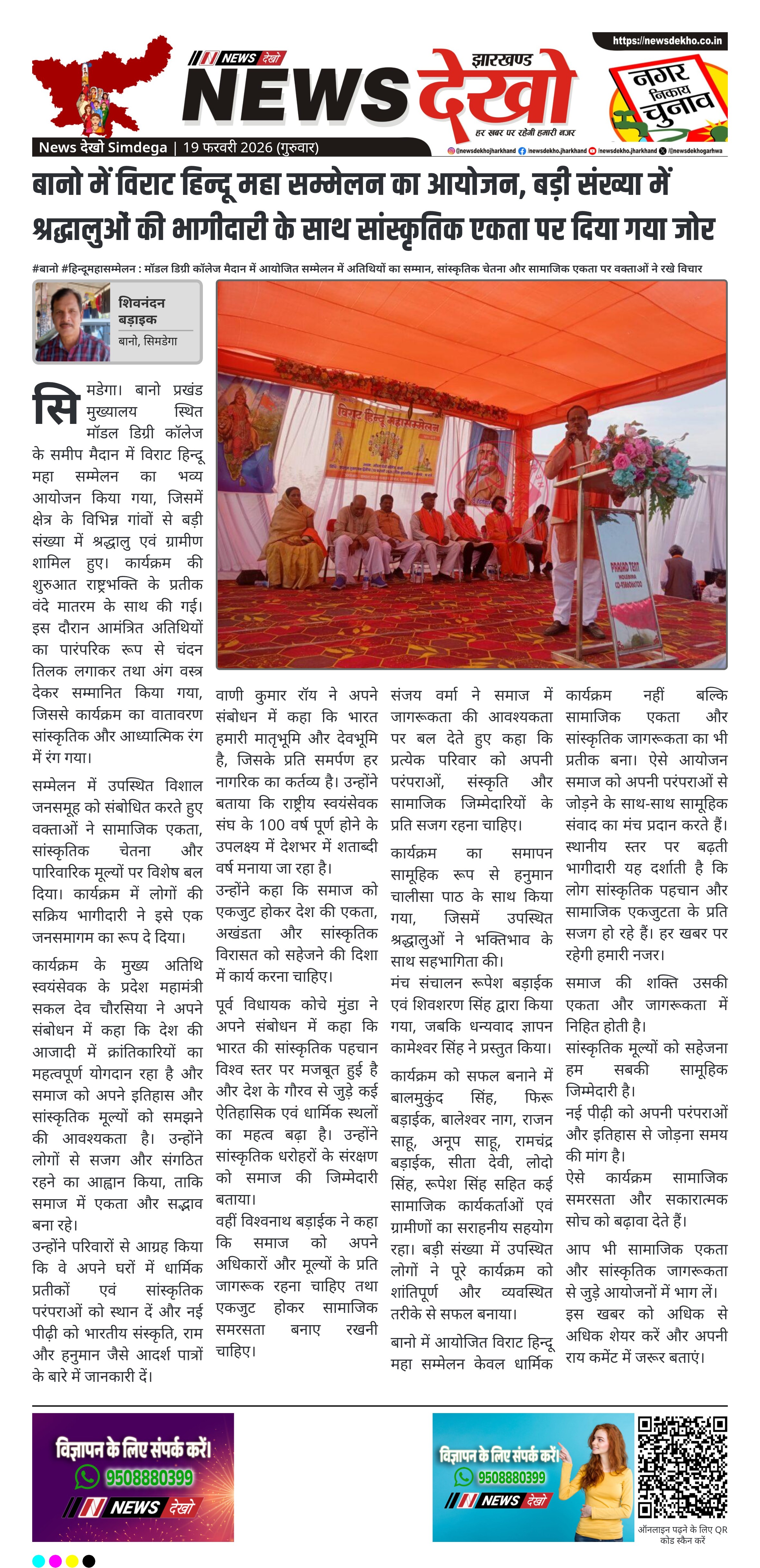सिमडेगा जिले के बानो प्रखंड मुख्यालय स्थित मॉडल डिग्री कॉलेज के समीप मैदान में विराट हिन्दू महा सम्मेलन का आयोजन किया गया, जिसमें बड़ी संख्या में लोगों की भागीदारी रही। कार्यक्रम की शुरुआत वंदे मातरम से हुई और अतिथियों का चंदन तिलक व अंगवस्त्र देकर सम्मान किया गया। सम्मेलन में सामाजिक एकता, सांस्कृतिक जागरूकता और संगठन पर विशेष जोर दिया गया।