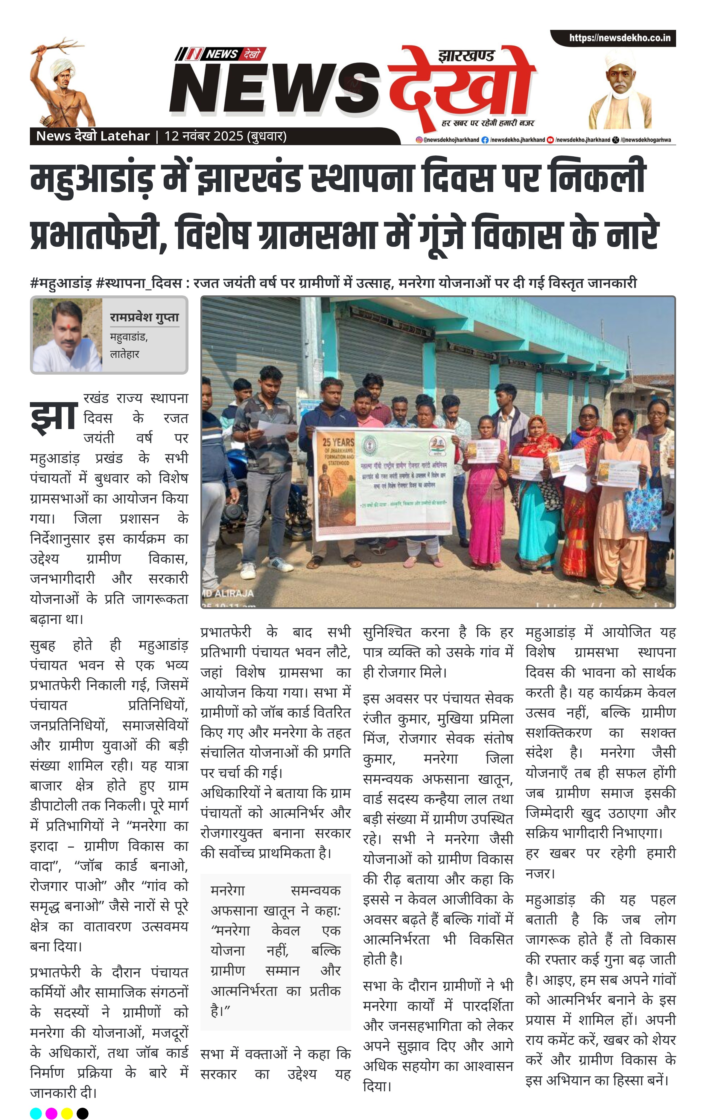 महुआडांड़ में आयोजित यह विशेष ग्रामसभा स्थापना दिवस की भावना को सार्थक करती है। यह कार्यक्रम केवल उत्सव नहीं, बल्कि ग्रामीण सशक्तिकरण का सशक्त संदेश है। मनरेगा जैसी योजनाएँ तब ही सफल होंगी जब ग्रामीण समाज इसकी जिम्मेदारी खुद उठाएगा और सक्रिय भागीदारी निभाएगा।