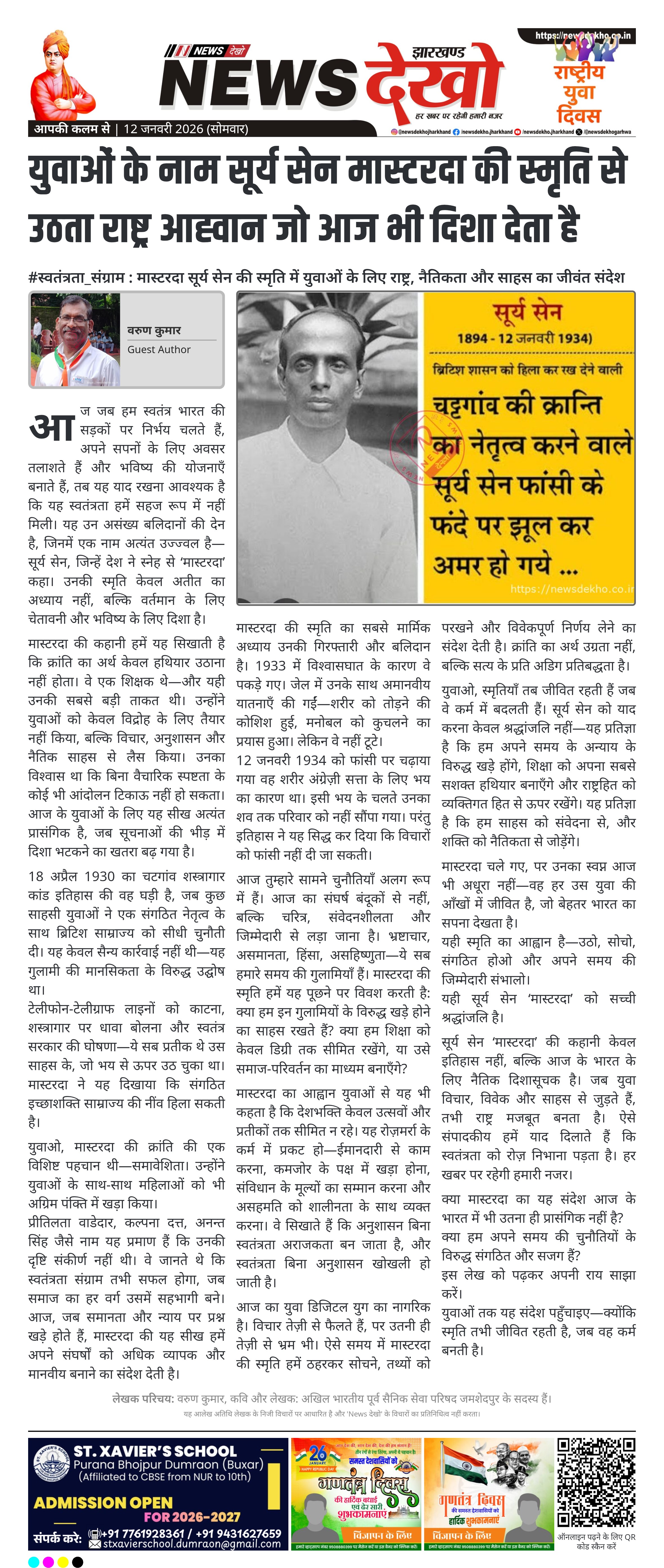#स्वतंत्रता_संग्राम : मास्टरदा सूर्य सेन की स्मृति में युवाओं के लिए राष्ट्र, नैतिकता और साहस का जीवंत संदेश
