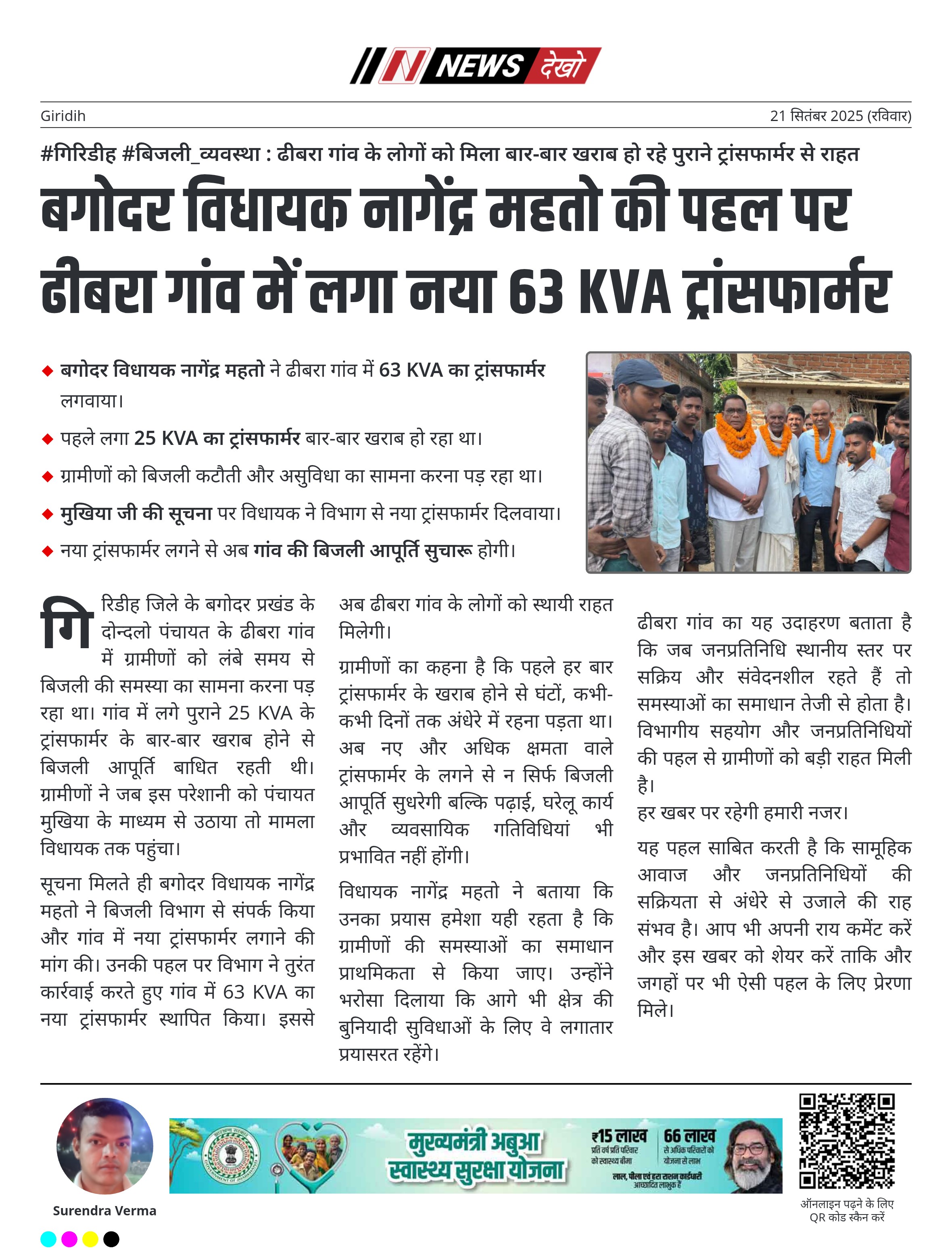 सूचना मिलते ही बगोदर विधायक नागेंद्र महतो ने बिजली विभाग से संपर्क किया और गांव में नया ट्रांसफार्मर लगाने की मांग की। उनकी पहल पर विभाग ने तुरंत कार्रवाई करते हुए गांव में 63 KVA का नया ट्रांसफार्मर स्थापित किया। इससे अब ढीबरा गांव के लोगों को स्थायी राहत मिलेगी।