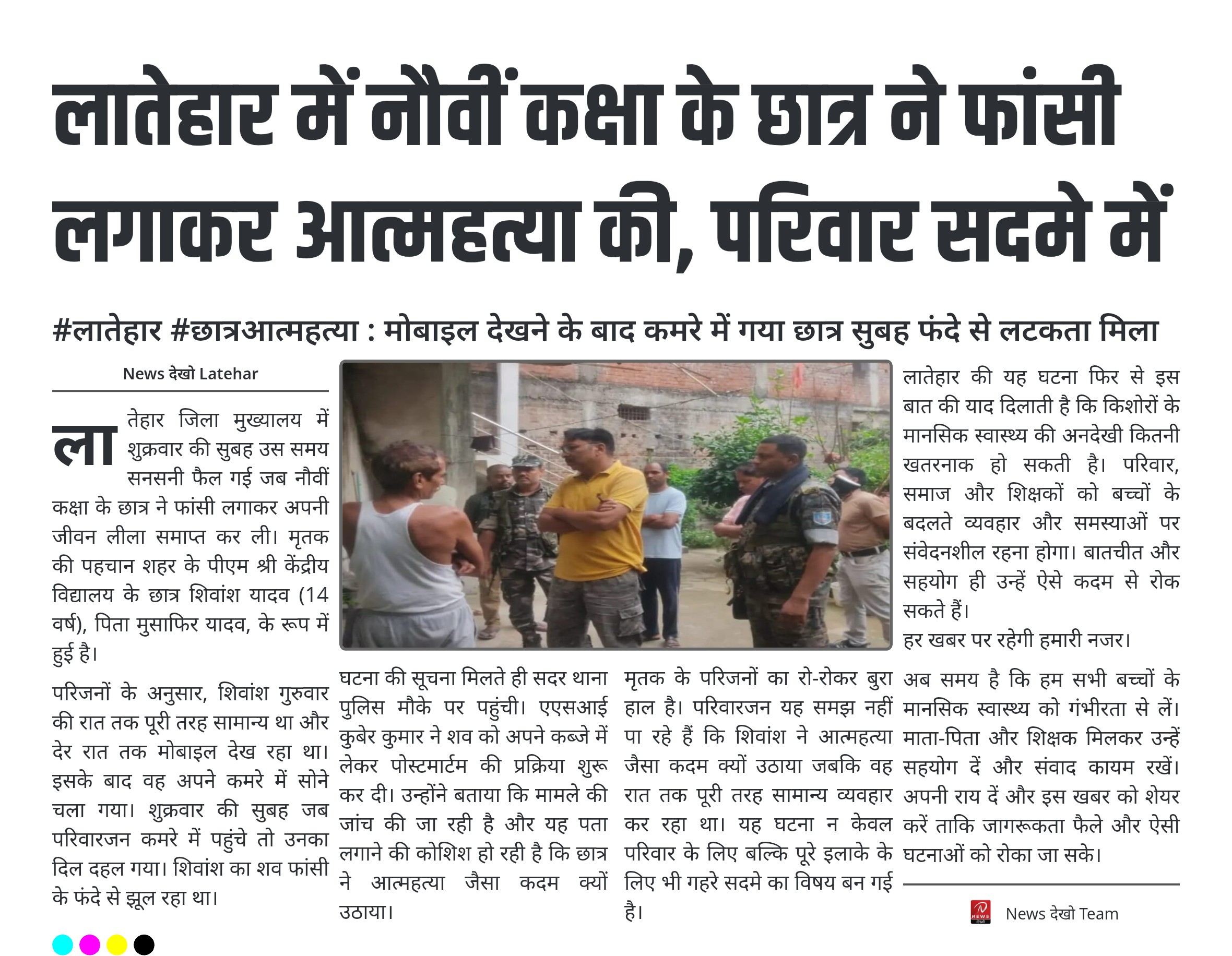 - लातेहार में कक्षा 9 का छात्र शिवांश यादव (14 वर्ष) ने आत्महत्या की।