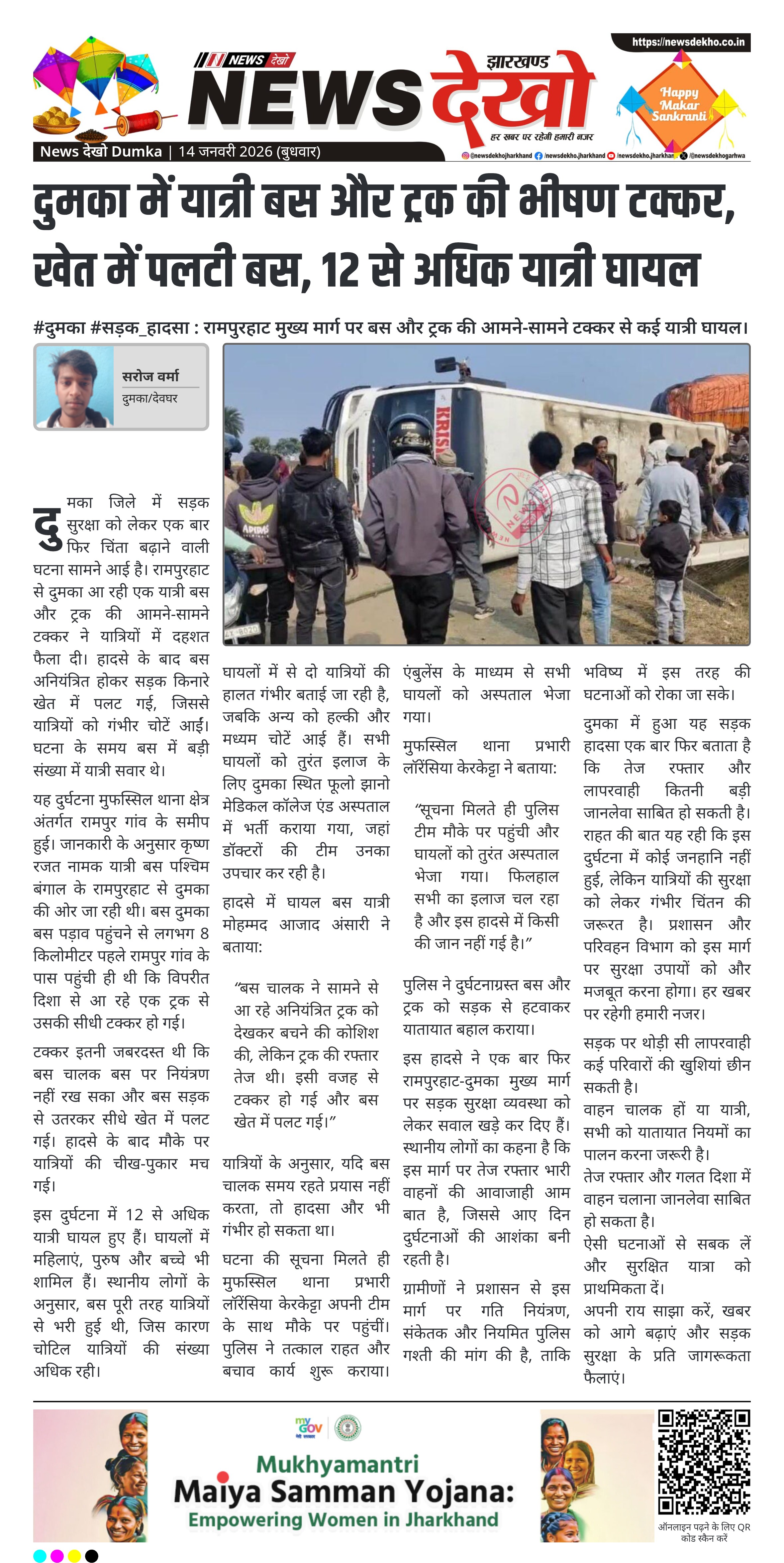 दुमका जिले में सड़क सुरक्षा को लेकर एक बार फिर चिंता बढ़ाने वाली घटना सामने आई है। रामपुरहाट से दुमका आ रही एक यात्री बस और ट्रक की आमने-सामने टक्कर ने यात्रियों में दहशत फैला दी। हादसे के बाद बस अनियंत्रित होकर सड़क किनारे खेत में पलट गई, जिससे यात्रियों को गंभीर चोटें आईं। घटना के समय बस में बड़ी संख्या में यात्री सवार थे।