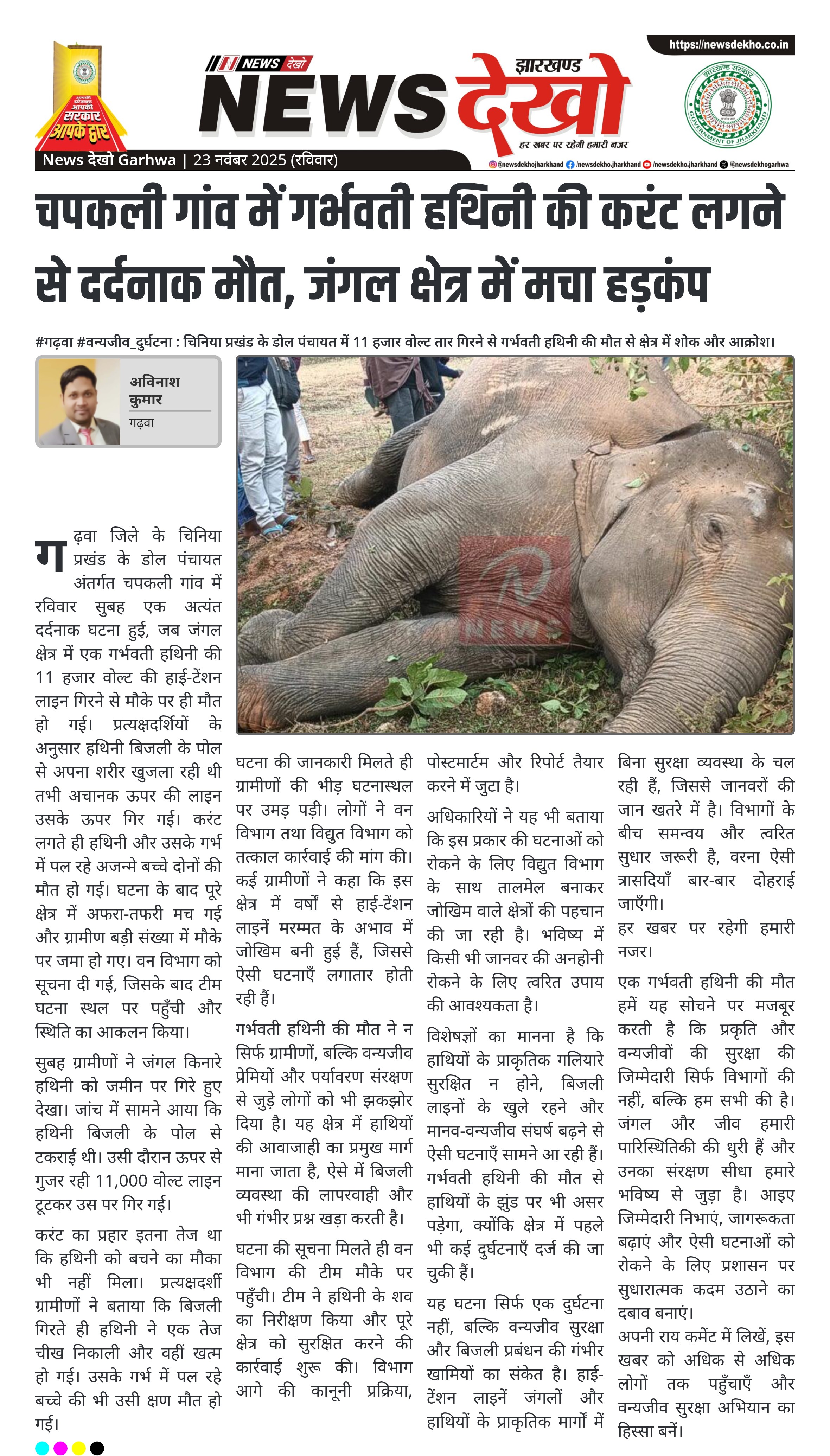 गढ़वा जिले के चिनिया प्रखंड के डोल पंचायत अंतर्गत चपकली गांव में रविवार सुबह एक अत्यंत दर्दनाक घटना हुई, जब जंगल क्षेत्र में एक गर्भवती हथिनी की 11 हजार वोल्ट की हाई-टेंशन लाइन गिरने से मौके पर ही मौत हो गई। प्रत्यक्षदर्शियों के अनुसार हथिनी बिजली के पोल से अपना शरीर खुजला रही थी तभी अचानक ऊपर की लाइन उसके ऊपर गिर गई। करंट लगते ही हथिनी और उसके गर्भ में पल रहे अजन्मे बच्चे दोनों की मौत हो गई। घटना के बाद पूरे क्षेत्र में अफरा-तफरी मच गई और ग्रामीण बड़ी संख्या में मौके पर जमा हो गए। वन विभाग को सूचना दी गई, जिसके बाद टीम घटना स्थल पर पहुँची और स्थिति का आकलन किया।