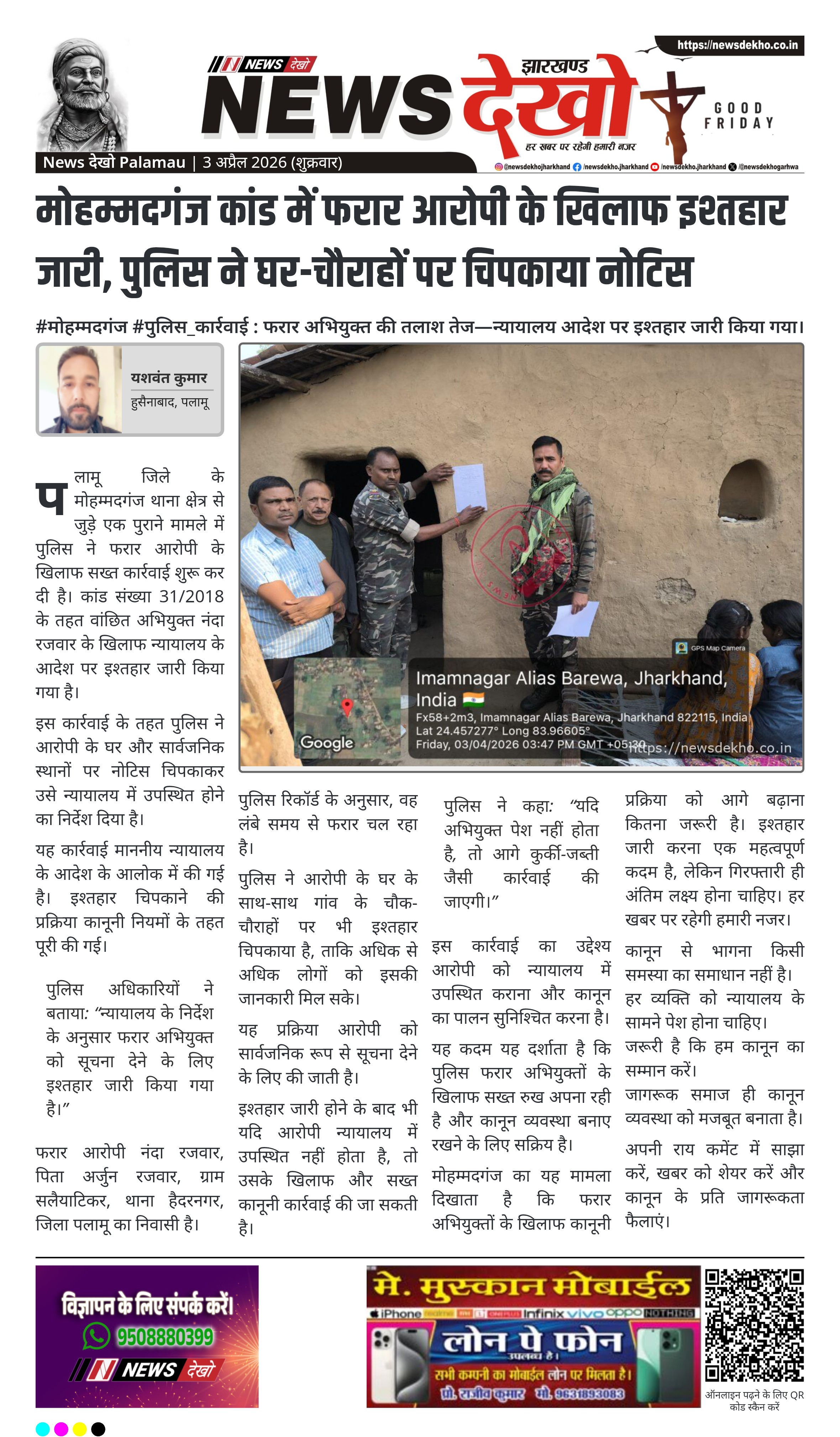 पलामू के मोहम्मदगंज थाना कांड संख्या 31/2018 में फरार अभियुक्त नंदा रजवार के खिलाफ पुलिस ने इश्तहार जारी किया है। न्यायालय के आदेश पर आरोपी के घर और सार्वजनिक स्थलों पर नोटिस चिपकाया गया। पुलिस अब आरोपी की गिरफ्तारी के लिए कार्रवाई तेज कर रही है। यह कदम कानूनी प्रक्रिया के तहत उठाया गया है।