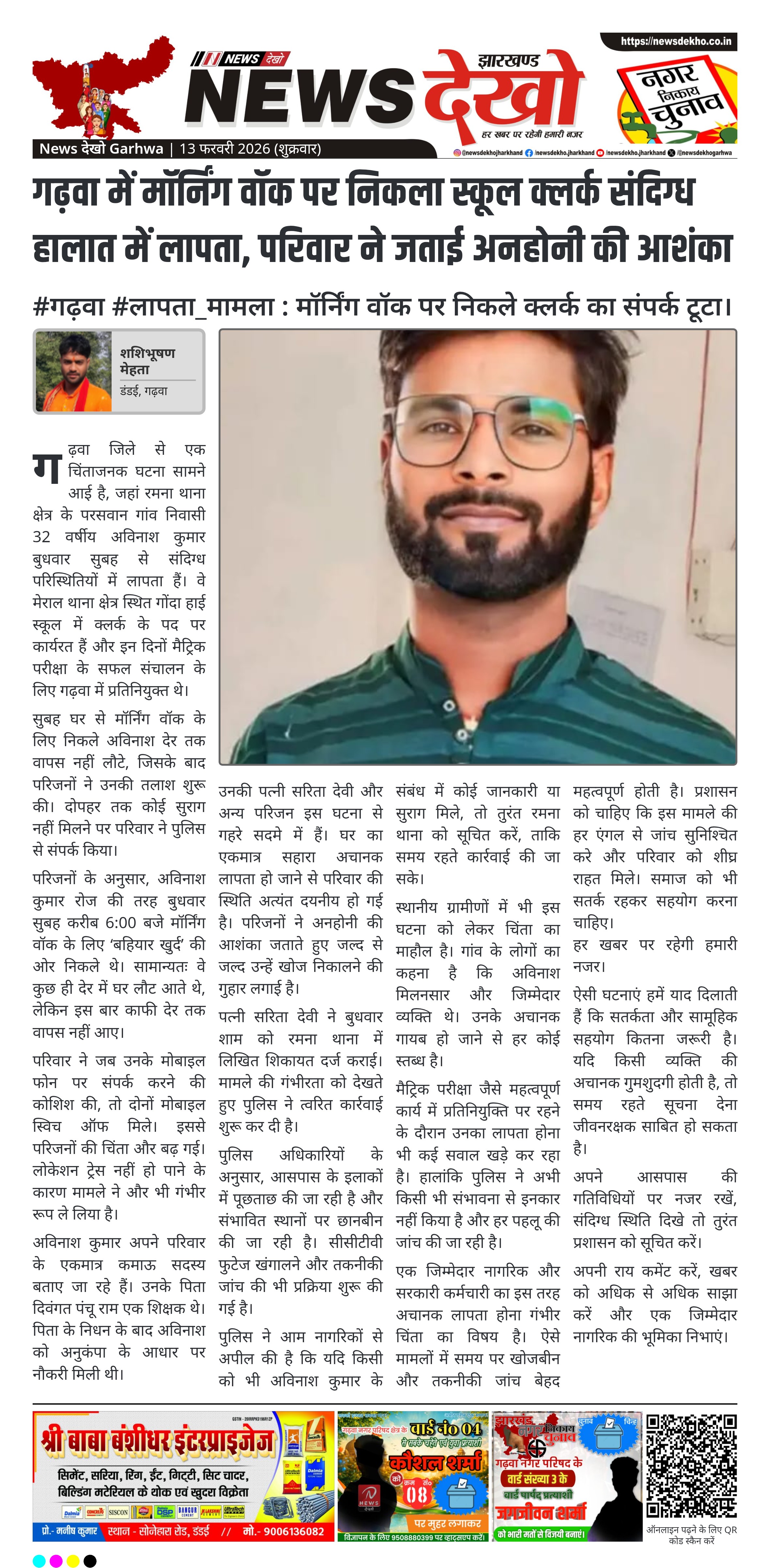 गढ़वा जिले से एक चिंताजनक घटना सामने आई है, जहां रमना थाना क्षेत्र के परसवान गांव निवासी 32 वर्षीय अविनाश कुमार बुधवार सुबह से संदिग्ध परिस्थितियों में लापता हैं। वे मेराल थाना क्षेत्र स्थित गोंदा हाई स्कूल में क्लर्क के पद पर कार्यरत हैं और इन दिनों मैट्रिक परीक्षा के सफल संचालन के लिए गढ़वा में प्रतिनियुक्त थे।