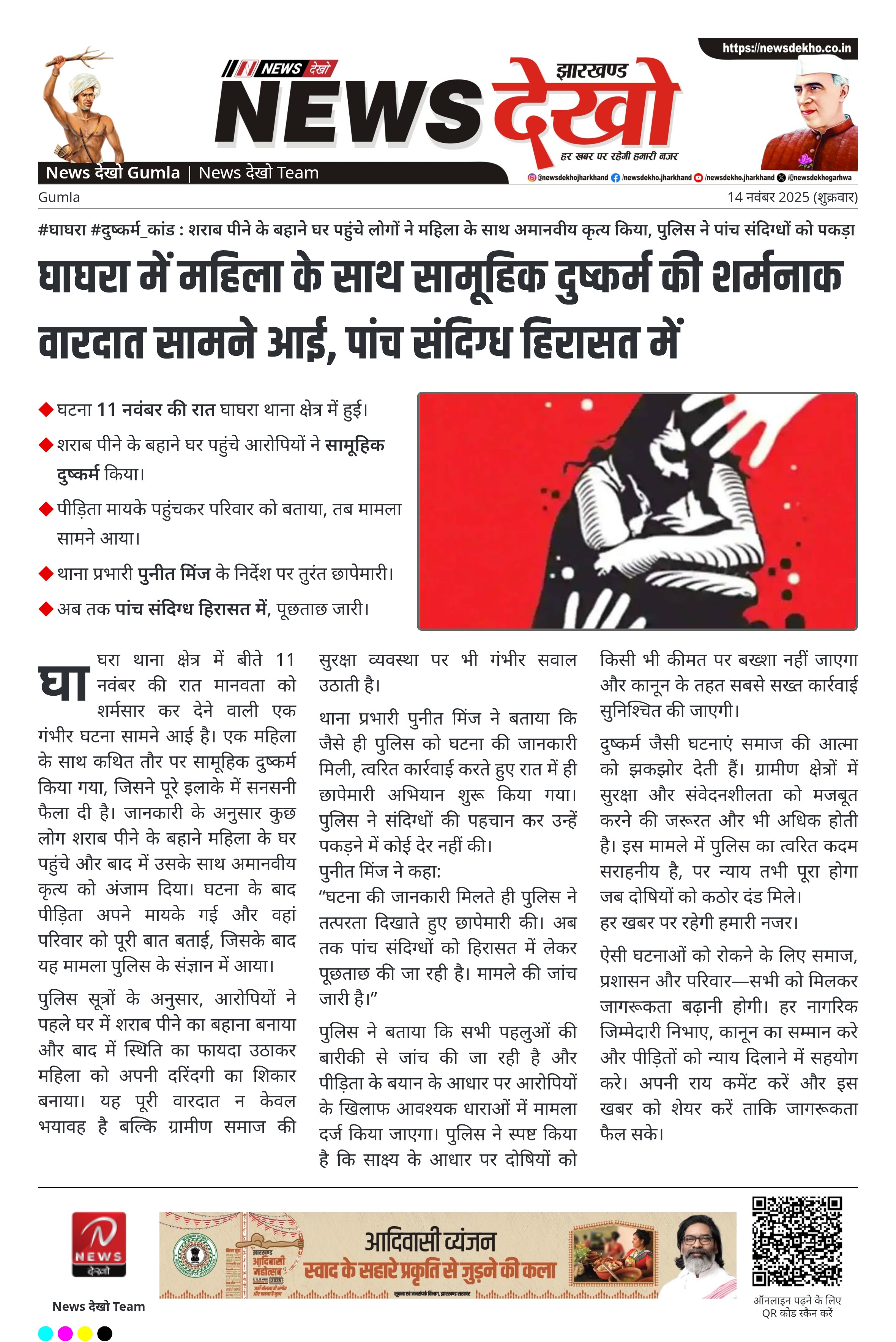 दुष्कर्म जैसी घटनाएं समाज की आत्मा को झकझोर देती हैं। ग्रामीण क्षेत्रों में सुरक्षा और संवेदनशीलता को मजबूत करने की जरूरत और भी अधिक होती है। इस मामले में पुलिस का त्वरित कदम सराहनीय है, पर न्याय तभी पूरा होगा जब दोषियों को कठोर दंड मिले।
