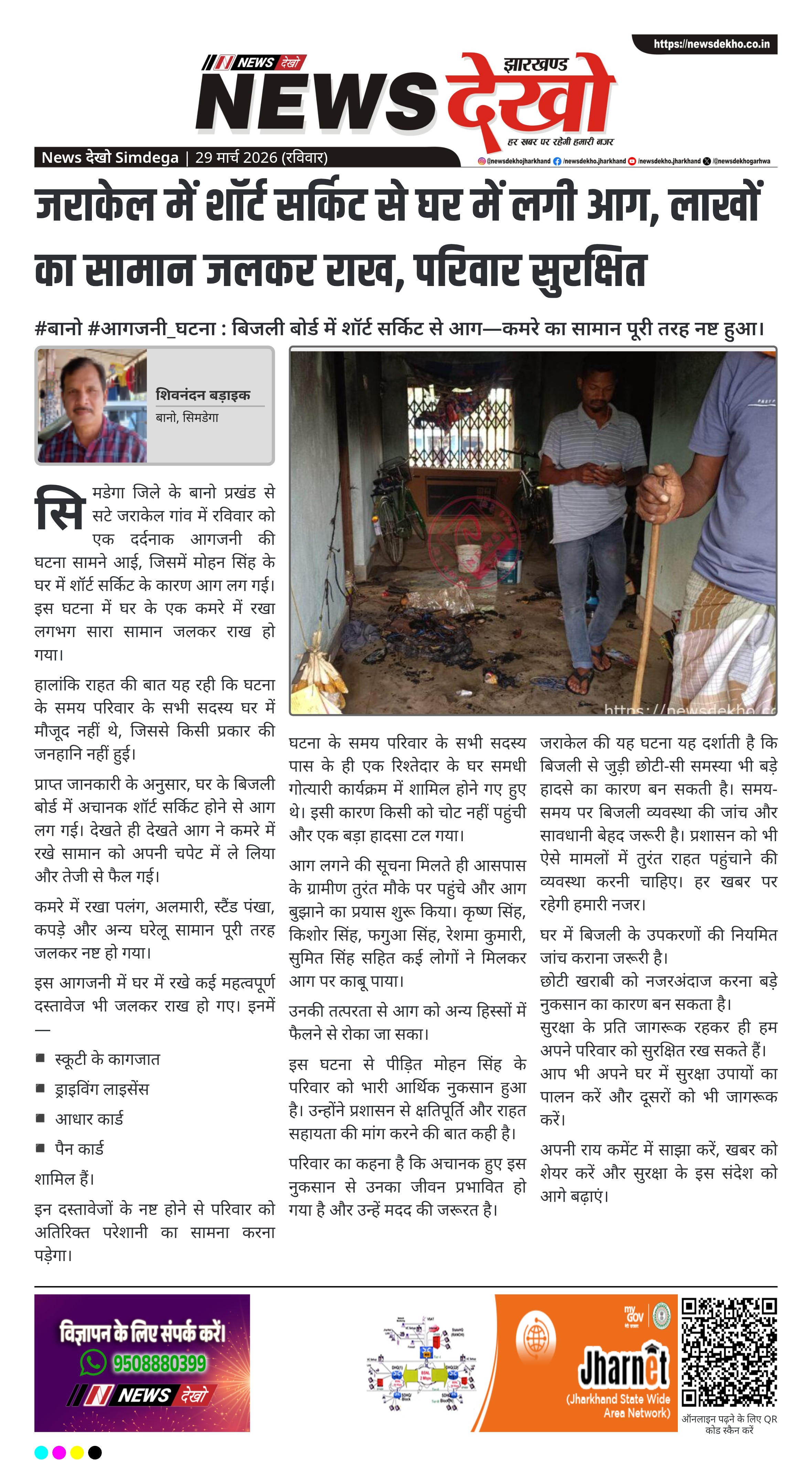 सिमडेगा जिले के बानो प्रखंड से सटे जराकेल गांव में रविवार को एक दर्दनाक आगजनी की घटना सामने आई, जिसमें मोहन सिंह के घर में शॉर्ट सर्किट के कारण आग लग गई। इस घटना में घर के एक कमरे में रखा लगभग सारा सामान जलकर राख हो गया।