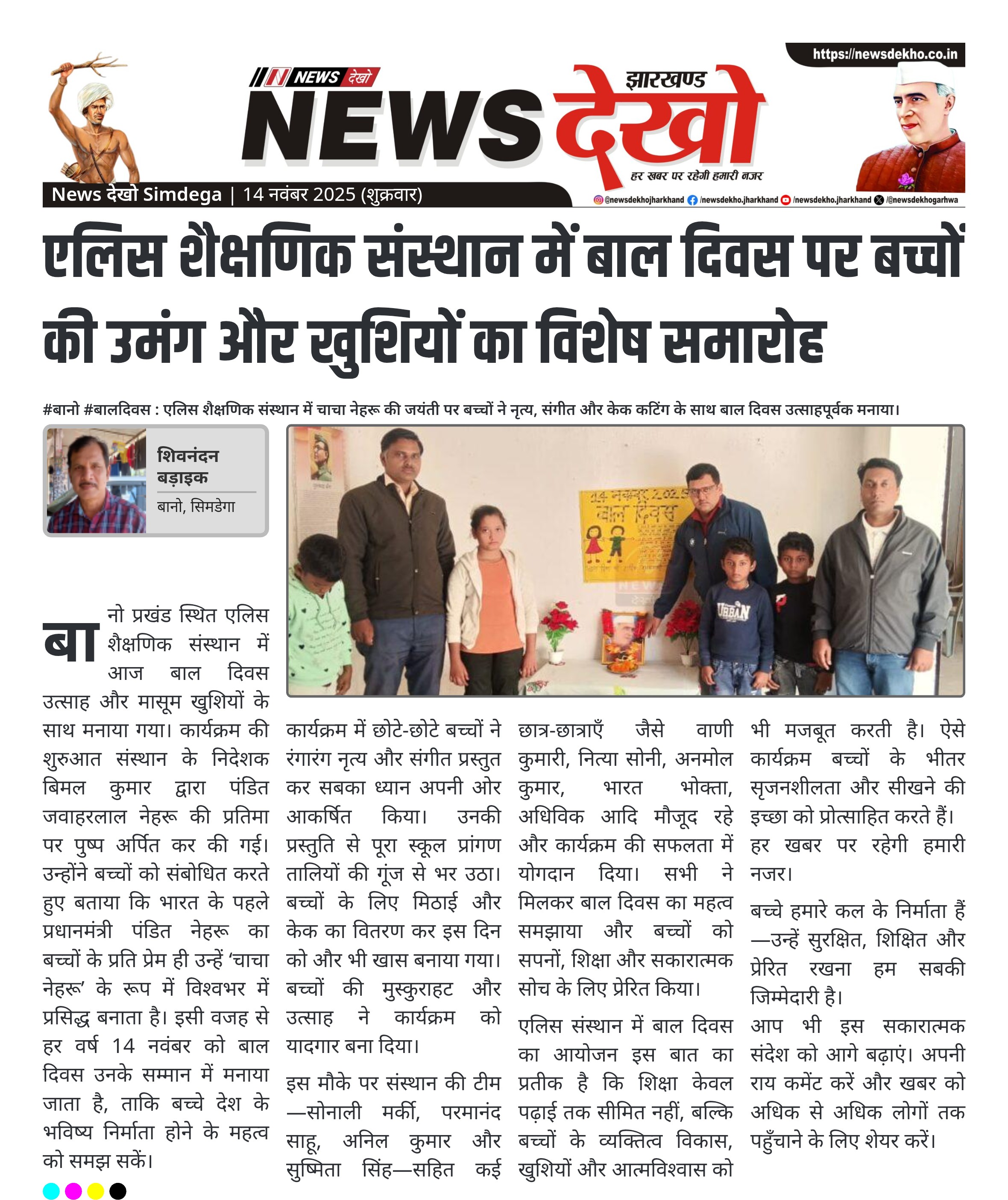 बानो प्रखंड स्थित एलिस शैक्षणिक संस्थान में आज बाल दिवस उत्साह और मासूम खुशियों के साथ मनाया गया। कार्यक्रम की शुरुआत संस्थान के निदेशक बिमल कुमार द्वारा पंडित जवाहरलाल नेहरू की प्रतिमा पर पुष्प अर्पित कर की गई। उन्होंने बच्चों को संबोधित करते हुए बताया कि भारत के पहले प्रधानमंत्री पंडित नेहरू का बच्चों के प्रति प्रेम ही उन्हें ‘चाचा नेहरू’ के रूप में विश्वभर में प्रसिद्ध बनाता है। इसी वजह से हर वर्ष 14 नवंबर को बाल दिवस उनके सम्मान में मनाया जाता है, ताकि बच्चे देश के भविष्य निर्माता होने के महत्व को समझ सकें।