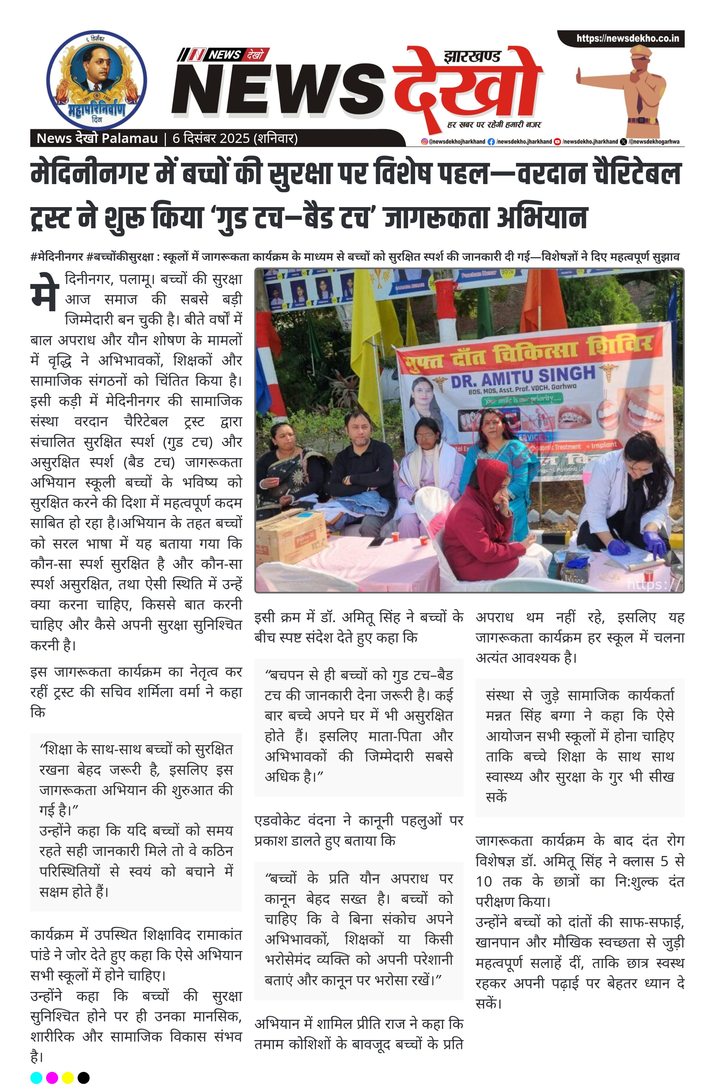 • वरदान चैरिटेबल ट्रस्ट ने मेदिनीनगर में शुरू किया गुड टच–बैड टच अवेयरनेस अभियान