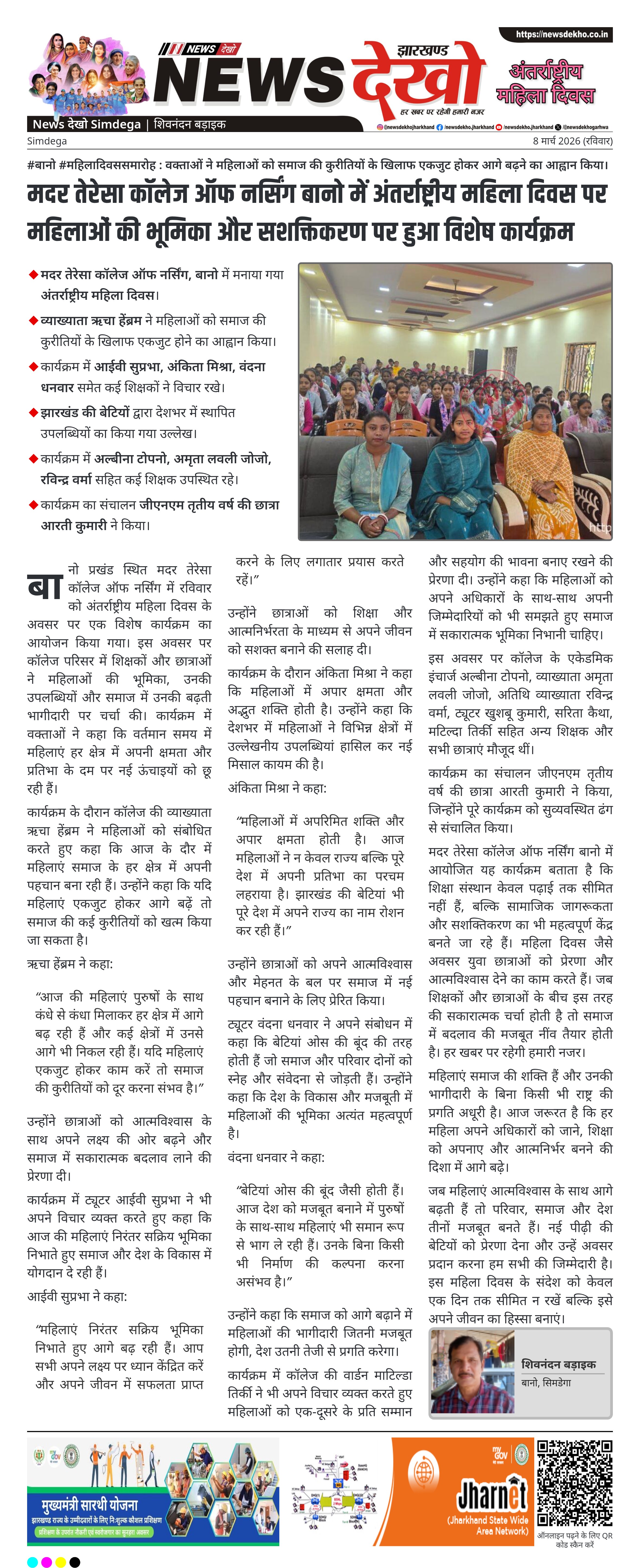 सिमडेगा जिले के बानो प्रखंड स्थित मदर तेरेसा कॉलेज ऑफ नर्सिंग में रविवार को अंतर्राष्ट्रीय महिला दिवस के अवसर पर विशेष कार्यक्रम आयोजित किया गया। कार्यक्रम में शिक्षकों और छात्राओं ने महिलाओं की सामाजिक, शैक्षणिक और राष्ट्रीय विकास में भूमिका पर चर्चा की। वक्ताओं ने कहा कि आज की महिलाएं हर क्षेत्र में अपनी मजबूत पहचान बना रही हैं। साथ ही समाज की कुरीतियों को समाप्त करने के लिए महिलाओं को एकजुट होकर आगे बढ़ने का संदेश दिया गया।
