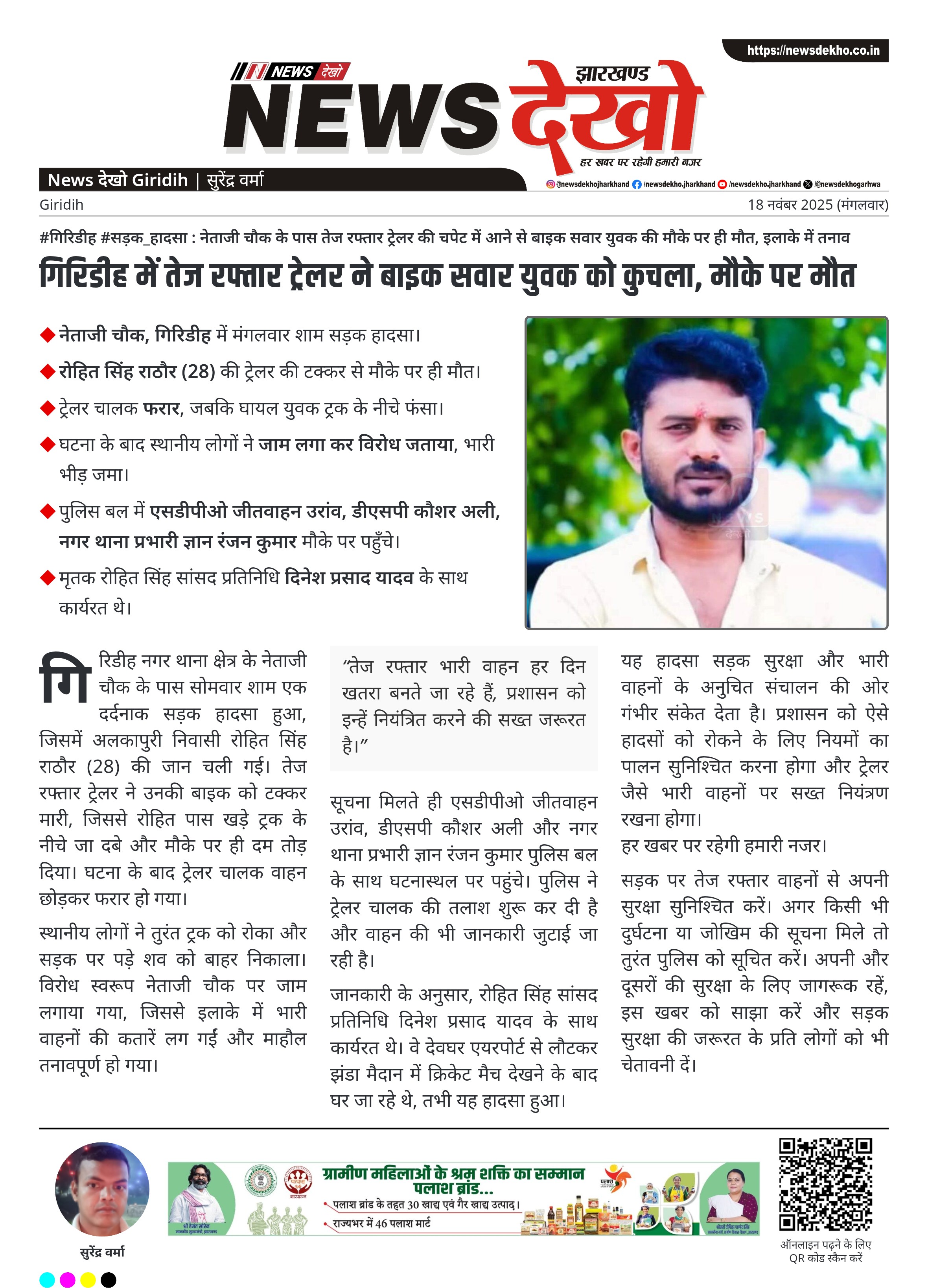 गिरिडीह नगर थाना क्षेत्र के नेताजी चौक के पास सोमवार शाम एक दर्दनाक सड़क हादसा हुआ, जिसमें अलकापुरी निवासी रोहित सिंह राठौर (28) की जान चली गई। तेज रफ्तार ट्रेलर ने उनकी बाइक को टक्कर मारी, जिससे रोहित पास खड़े ट्रक के नीचे जा दबे और मौके पर ही दम तोड़ दिया। घटना के बाद ट्रेलर चालक वाहन छोड़कर फरार हो गया।