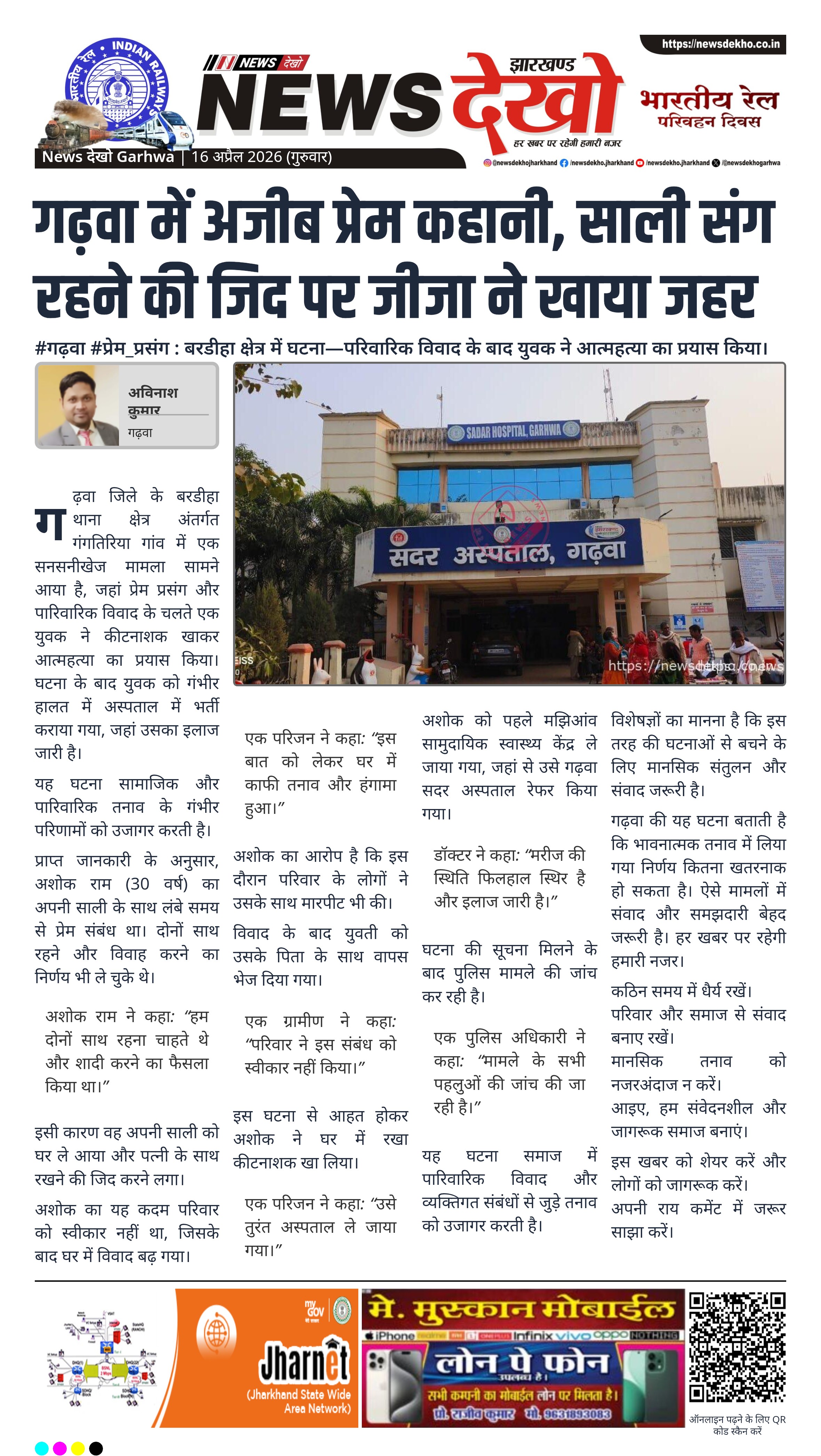 #गढ़वा #प्रेम_प्रसंग : बरडीहा क्षेत्र में घटना—परिवारिक विवाद के बाद युवक ने आत्महत्या का प्रयास किया।