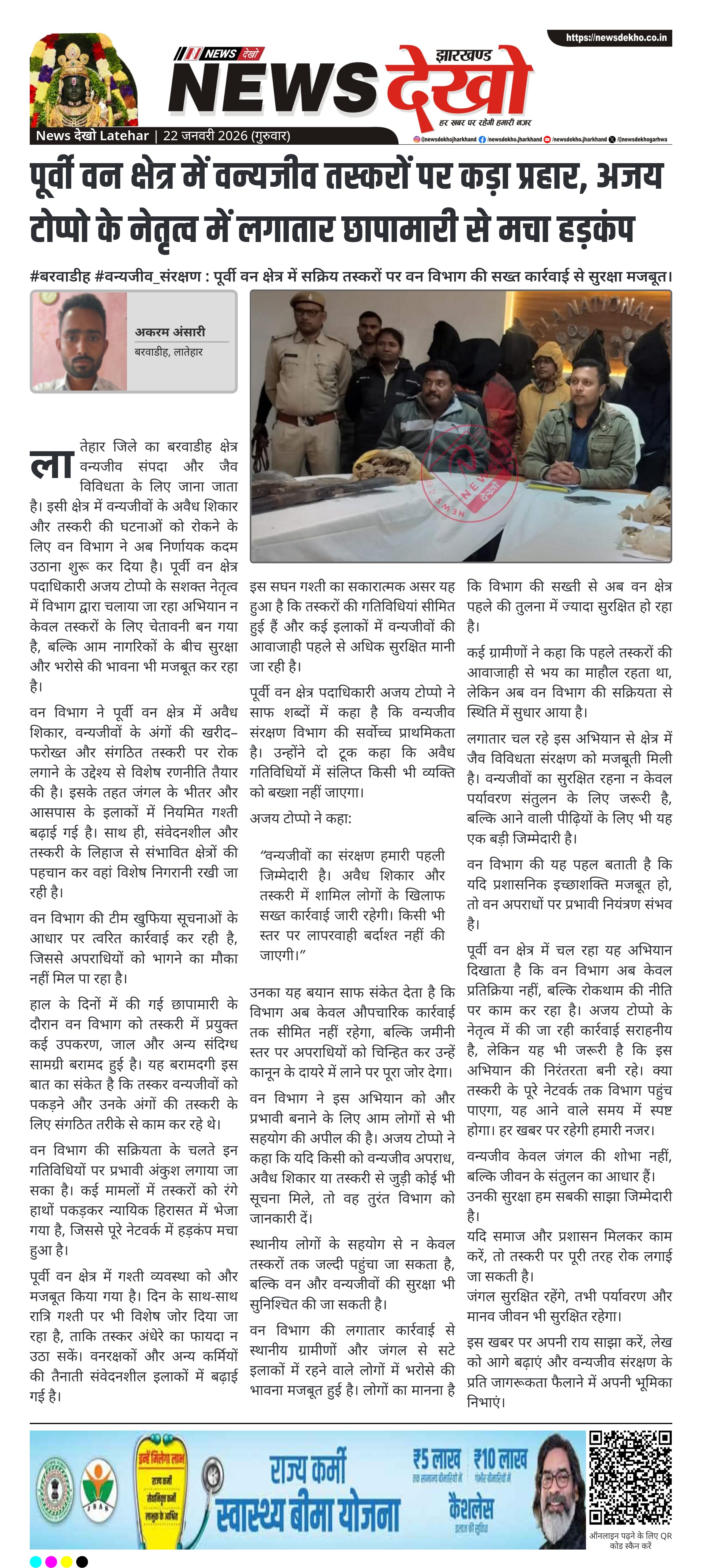 लातेहार जिले के बरवाडीह क्षेत्र अंतर्गत पूर्वी वन क्षेत्र में वन्यजीव तस्करी और अवैध शिकार के खिलाफ वन विभाग ने सख्त अभियान तेज कर दिया है। पूर्वी वन क्षेत्र पदाधिकारी अजय टोप्पो के नेतृत्व में लगातार छापामारी और गश्ती के जरिए तस्करों पर शिकंजा कसा जा रहा है। हाल के दिनों में कई तस्करों की गिरफ्तारी और तस्करी से जुड़े सामान की बरामदगी से वन अपराधियों में भय का माहौल बना है। यह अभियान क्षेत्र में वन्यजीव संरक्षण और जैव विविधता की सुरक्षा के लिए बेहद अहम माना जा रहा है।
