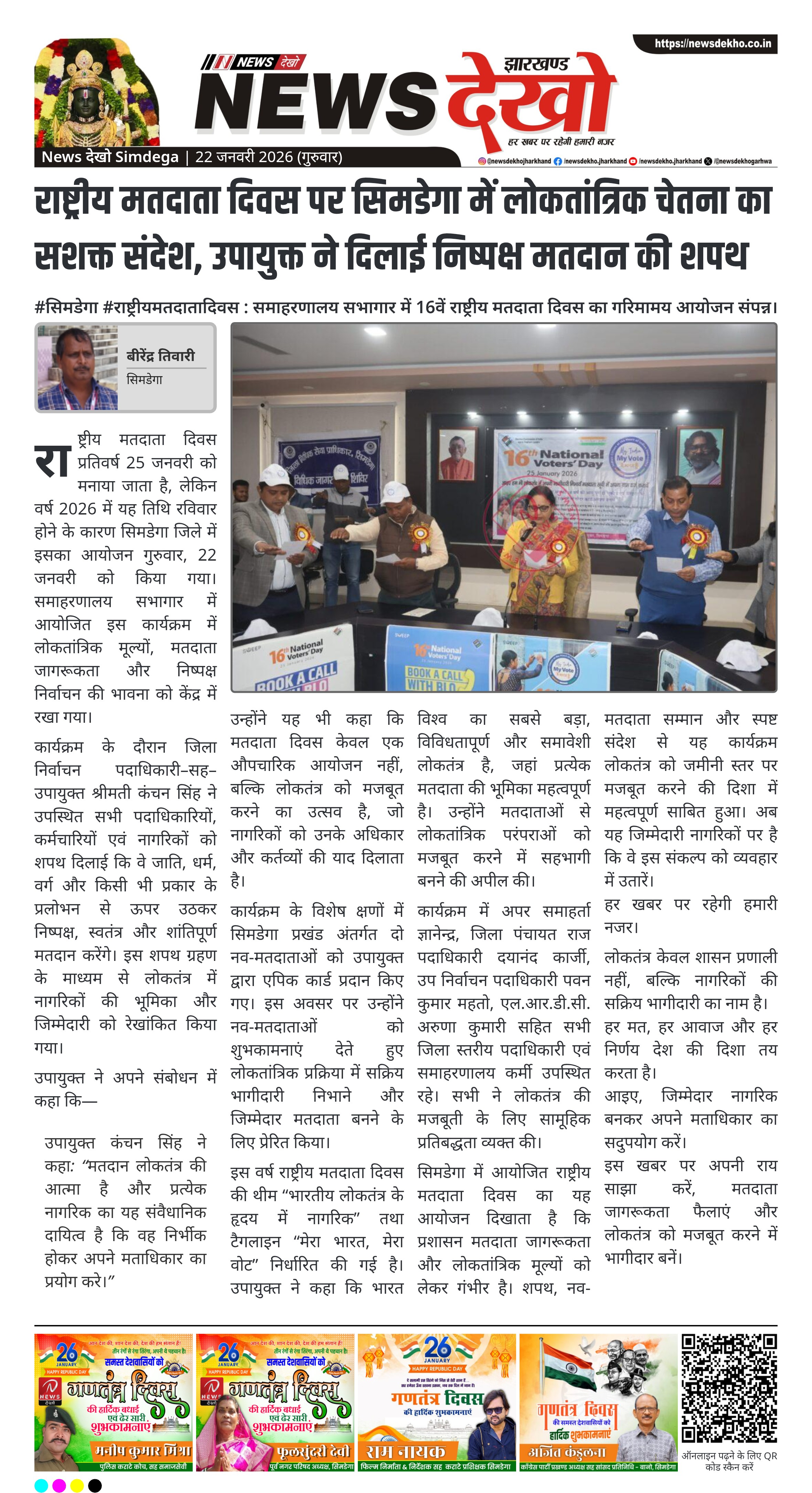 सिमडेगा में 16वें राष्ट्रीय मतदाता दिवस का आयोजन गुरुवार, 22 जनवरी 2026 को समाहरणालय सभागार में निर्वाचन आयोग के निर्देशानुसार किया गया। जिला निर्वाचन पदाधिकारी सह उपायुक्त कंचन सिंह की उपस्थिति में अधिकारियों, कर्मियों और नागरिकों को निष्पक्ष व निर्भीक मतदान की शपथ दिलाई गई। कार्यक्रम का उद्देश्य लोकतंत्र में नागरिकों की सक्रिय भागीदारी और मतदान के महत्व को सुदृढ़ करना रहा। इस दौरान नव-मतदाताओं को एपिक कार्ड भी प्रदान किए गए।