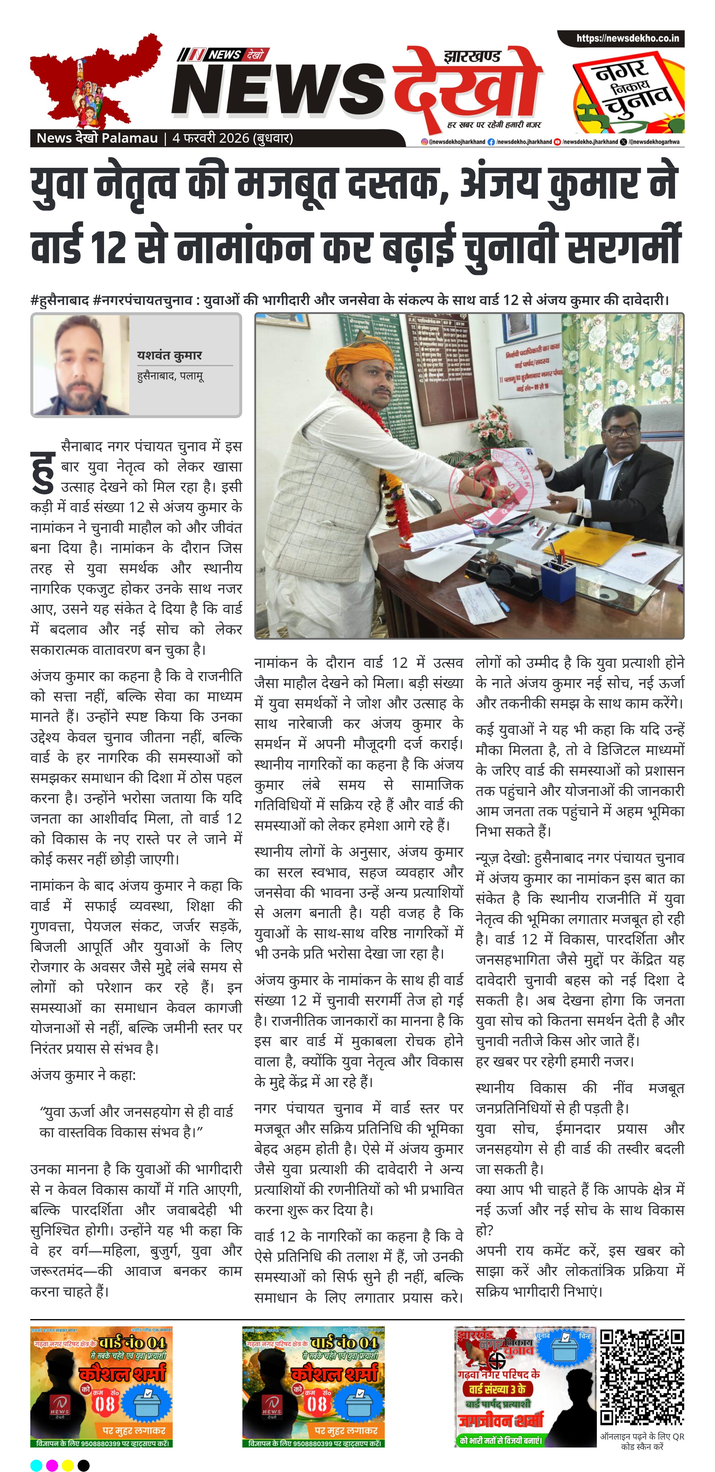 न्यूज़ देखो: हुसैनाबाद नगर पंचायत चुनाव में अंजय कुमार का नामांकन इस बात का संकेत है कि स्थानीय राजनीति में युवा नेतृत्व की भूमिका लगातार मजबूत हो रही है। वार्ड 12 में विकास, पारदर्शिता और जनसहभागिता जैसे मुद्दों पर केंद्रित यह दावेदारी चुनावी बहस को नई दिशा दे सकती है। अब देखना होगा कि जनता युवा सोच को कितना समर्थन देती है और चुनावी नतीजे किस ओर जाते हैं।