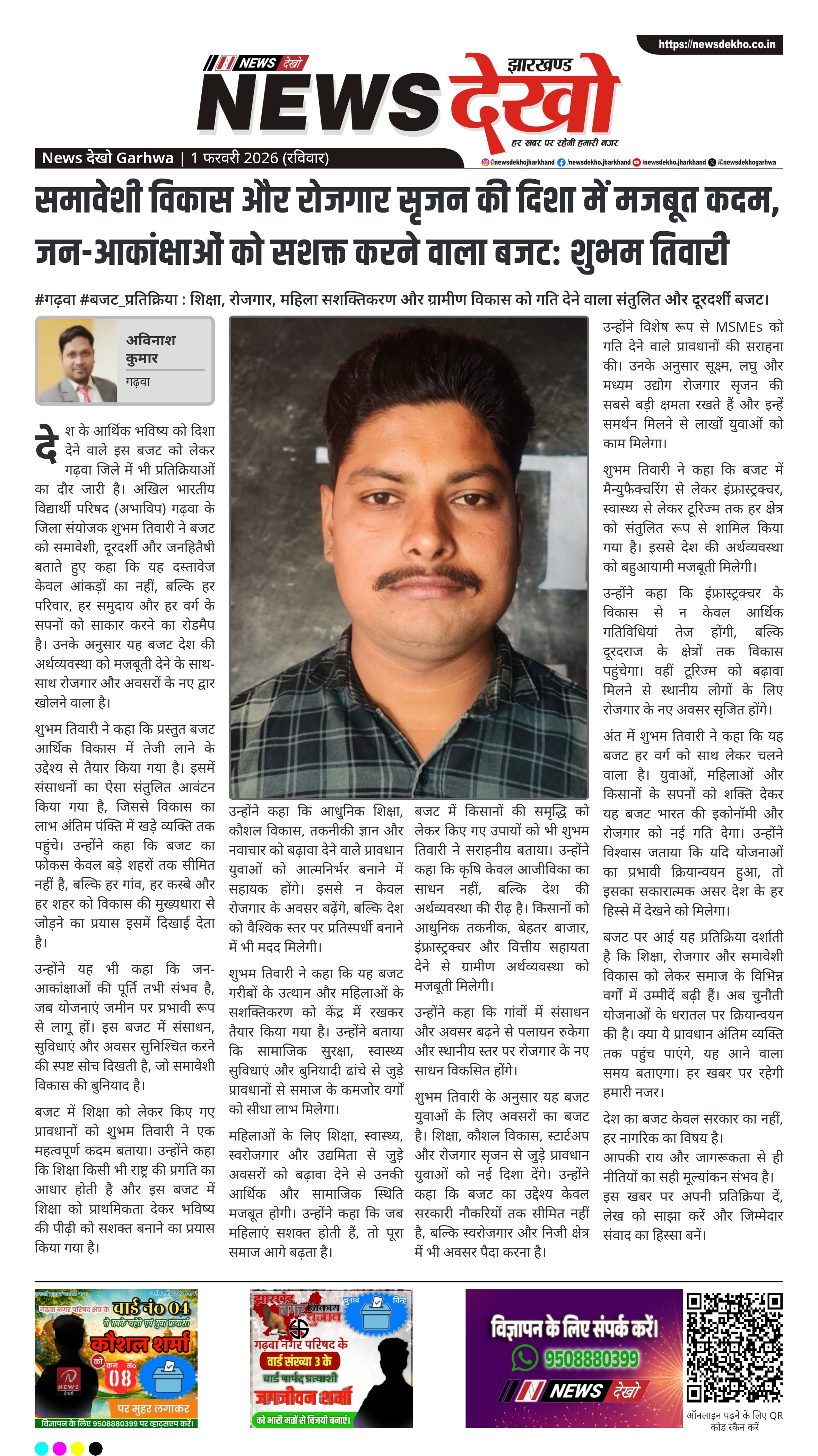देश के आर्थिक भविष्य को दिशा देने वाले इस बजट को लेकर गढ़वा जिले में भी प्रतिक्रियाओं का दौर जारी है। अखिल भारतीय विद्यार्थी परिषद (अभाविप) गढ़वा के जिला संयोजक शुभम तिवारी ने बजट को समावेशी, दूरदर्शी और जनहितैषी बताते हुए कहा कि यह दस्तावेज केवल आंकड़ों का नहीं, बल्कि हर परिवार, हर समुदाय और हर वर्ग के सपनों को साकार करने का रोडमैप है। उनके अनुसार यह बजट देश की अर्थव्यवस्था को मजबूती देने के साथ-साथ रोजगार और अवसरों के नए द्वार खोलने वाला है।