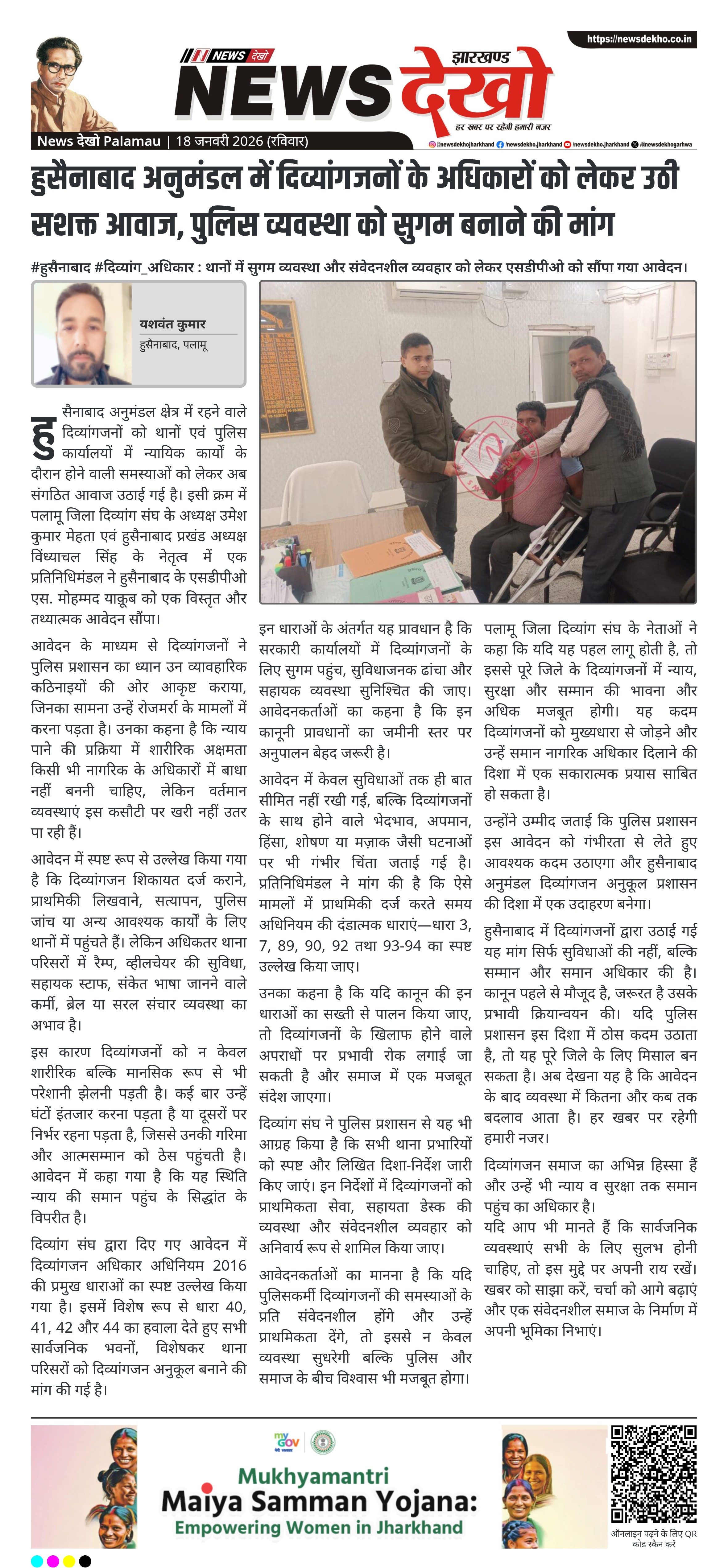 हुसैनाबाद अनुमंडल में निवासरत दिव्यांगजनों को पुलिस एवं न्यायिक प्रक्रियाओं के दौरान हो रही कठिनाइयों को लेकर एक महत्वपूर्ण पहल सामने आई है। पलामू जिला दिव्यांग संघ के नेतृत्व में दिव्यांगजनों ने एसडीपीओ को आवेदन सौंपकर थाना परिसरों को दिव्यांगजन अनुकूल बनाने की मांग की। आवेदन में दिव्यांगजन अधिकार अधिनियम 2016 के तहत सुगम, सम्मानजनक और संवेदनशील व्यवस्था लागू करने पर जोर दिया गया। यह पहल दिव्यांगजनों की गरिमा, न्याय और समान अधिकार सुनिश्चित करने की दिशा में अहम मानी जा रही है।
