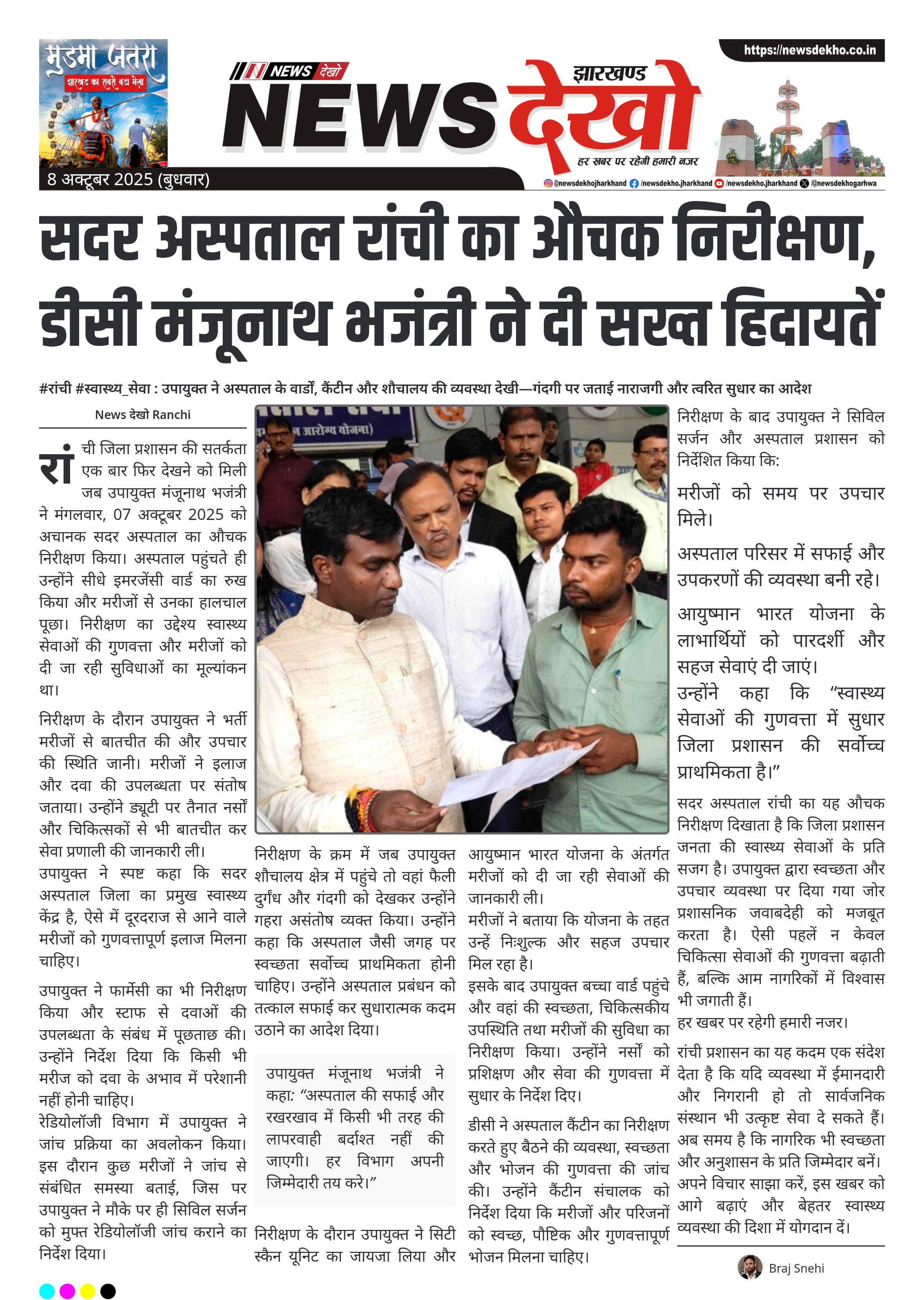 रांची जिला प्रशासन की सतर्कता एक बार फिर देखने को मिली जब उपायुक्त मंजूनाथ भजंत्री ने मंगलवार, 07 अक्टूबर 2025 को अचानक सदर अस्पताल का औचक निरीक्षण किया। अस्पताल पहुंचते ही उन्होंने सीधे इमरजेंसी वार्ड का रुख किया और मरीजों से उनका हालचाल पूछा। निरीक्षण का उद्देश्य स्वास्थ्य सेवाओं की गुणवत्ता और मरीजों को दी जा रही सुविधाओं का मूल्यांकन था।