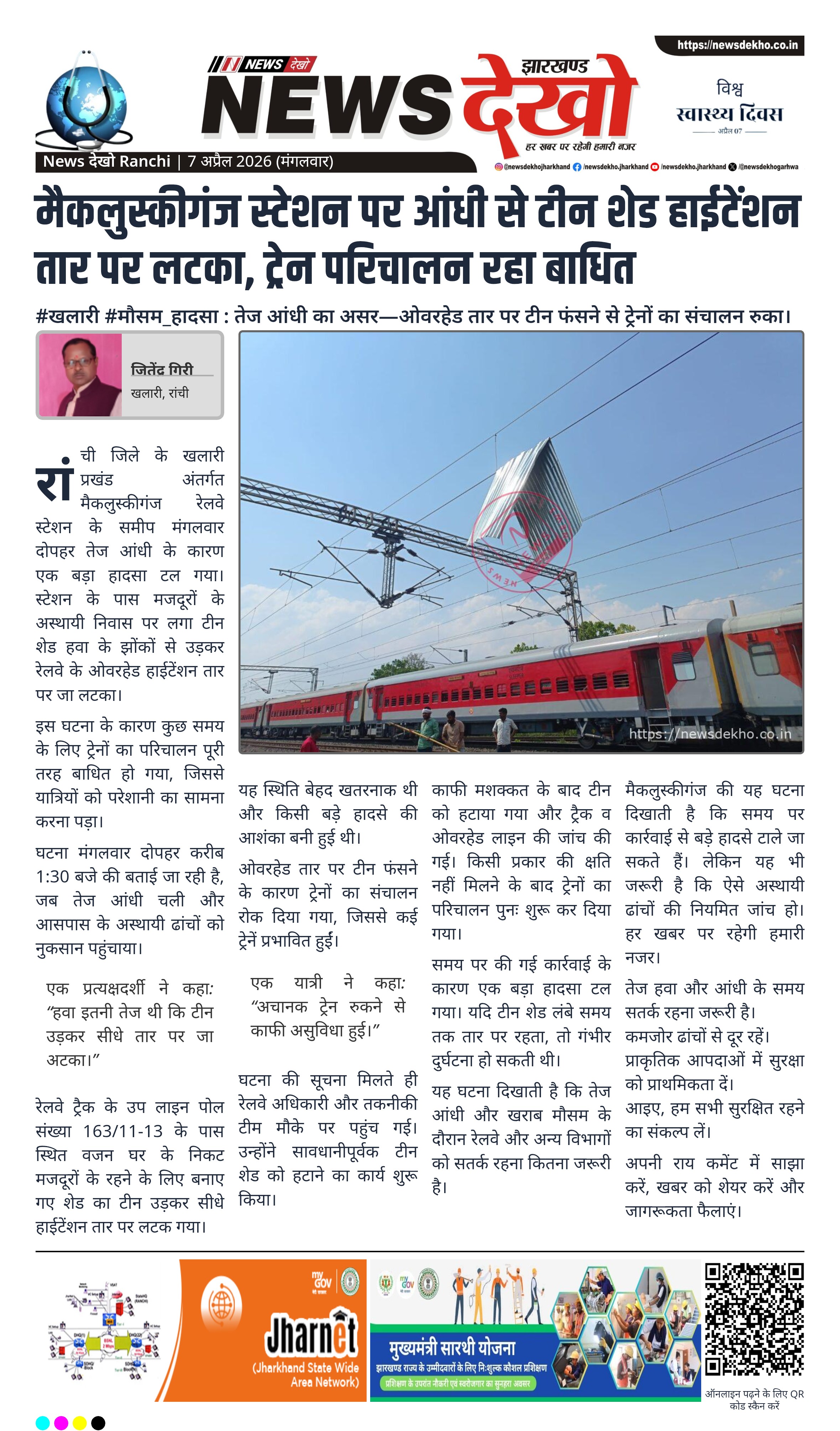 रांची के खलारी स्थित मैकलुस्कीगंज रेलवे स्टेशन के पास आंधी से टीन शेड हाईटेंशन तार पर लटक गया। इससे ट्रेनों का परिचालन कुछ समय के लिए बाधित रहा। रेलवे टीम ने मौके पर पहुंचकर टीन हटाया और स्थिति सामान्य की। हादसे में कोई बड़ा नुकसान नहीं हुआ।