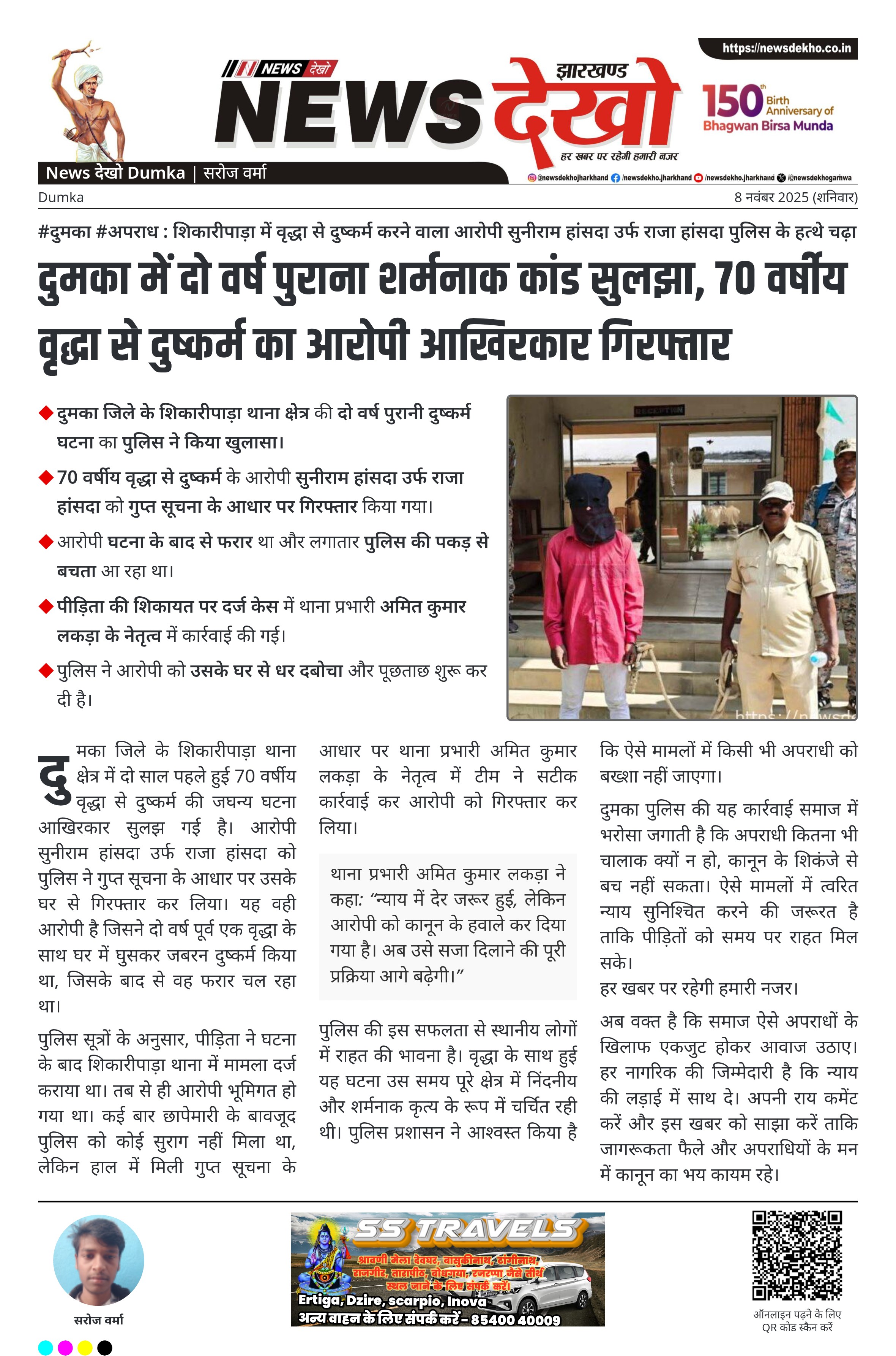 दुमका जिले के शिकारीपाड़ा थाना क्षेत्र में दो साल पहले हुई 70 वर्षीय वृद्धा से दुष्कर्म की जघन्य घटना आखिरकार सुलझ गई है। आरोपी सुनीराम हांसदा उर्फ राजा हांसदा को पुलिस ने गुप्त सूचना के आधार पर उसके घर से गिरफ्तार कर लिया। यह वही आरोपी है जिसने दो वर्ष पूर्व एक वृद्धा के साथ घर में घुसकर जबरन दुष्कर्म किया था, जिसके बाद से वह फरार चल रहा था।