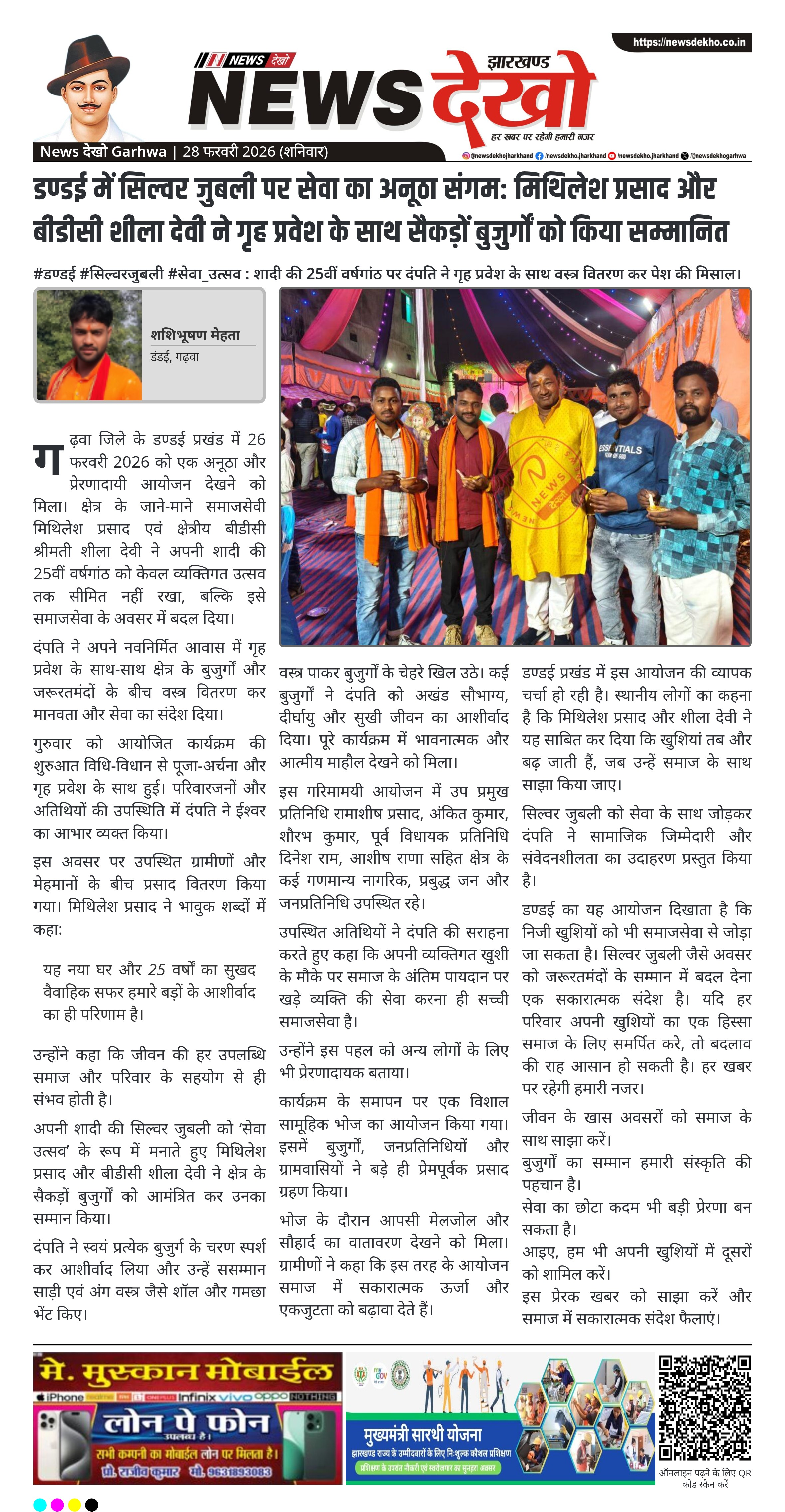 गढ़वा जिले के डण्डई प्रखंड में 26 फरवरी 2026 को एक अनूठा और प्रेरणादायी आयोजन देखने को मिला। क्षेत्र के जाने-माने समाजसेवी मिथिलेश प्रसाद एवं क्षेत्रीय बीडीसी श्रीमती शीला देवी ने अपनी शादी की 25वीं वर्षगांठ को केवल व्यक्तिगत उत्सव तक सीमित नहीं रखा, बल्कि इसे समाजसेवा के अवसर में बदल दिया।