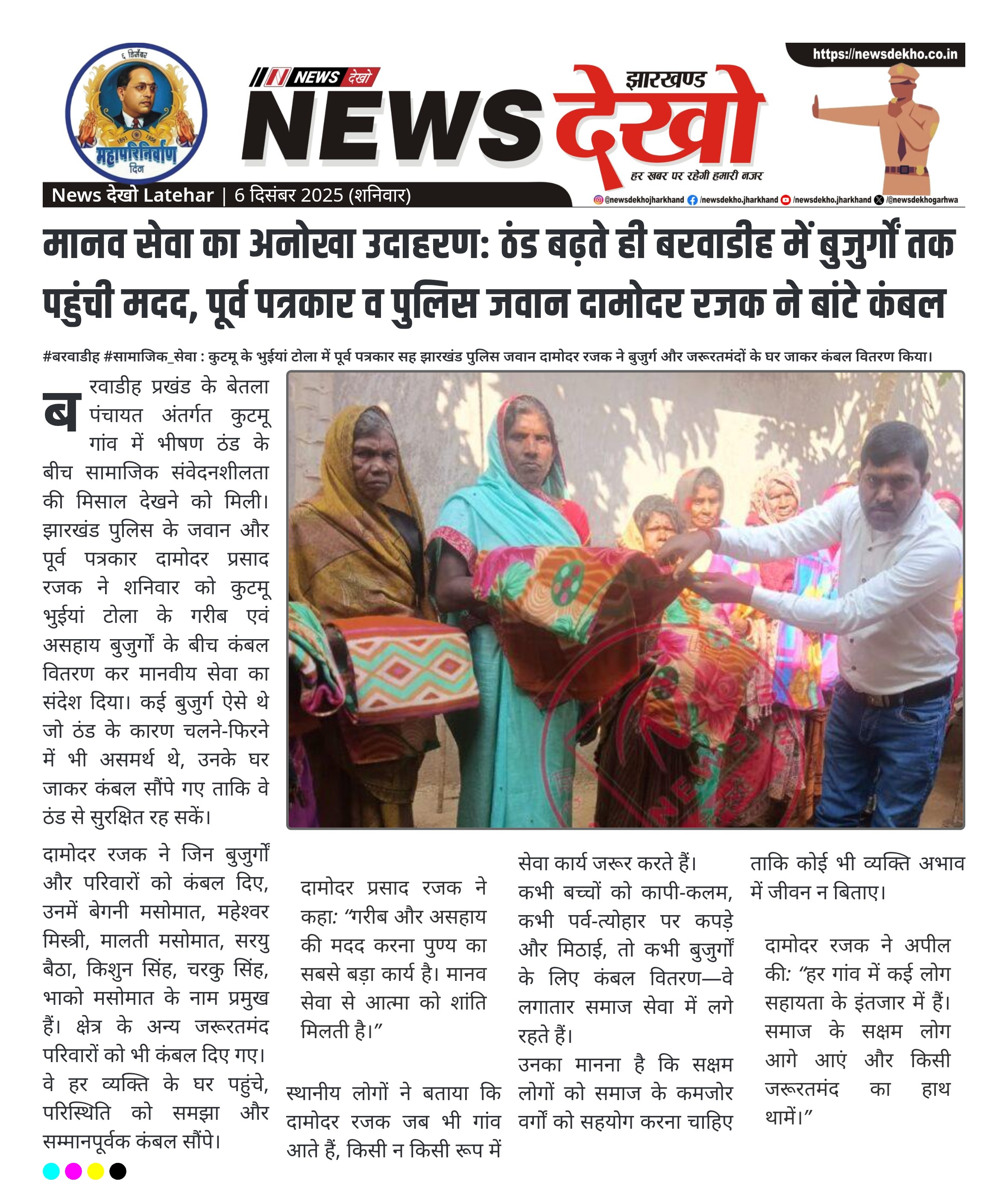 बरवाडीह प्रखंड के बेतला पंचायत अंतर्गत कुटमू गांव में भीषण ठंड के बीच सामाजिक संवेदनशीलता की मिसाल देखने को मिली। झारखंड पुलिस के जवान और पूर्व पत्रकार दामोदर प्रसाद रजक ने शनिवार को कुटमू भुईयां टोला के गरीब एवं असहाय बुजुर्गों के बीच कंबल वितरण कर मानवीय सेवा का संदेश दिया। कई बुजुर्ग ऐसे थे जो ठंड के कारण चलने-फिरने में भी असमर्थ थे, उनके घर जाकर कंबल सौंपे गए ताकि वे ठंड से सुरक्षित रह सकें।